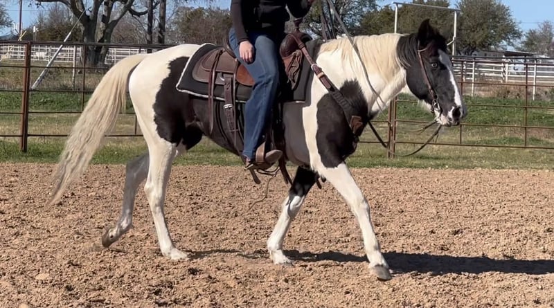 ONLINE AUCTION Place your bids at www.PlatinumEquineAuction.com Starting Bid $3500 Auction ends February 1st, 2026 Need a new saddle? Check out White Rock Saddles on our website or Facebook Zoey is a gorgeous 14.1H, 13 yr old black and white paint mare with one blue eye and a HUGE loving personality! She is a very gentle mare that is suitable for anyone! She’s incredibly safe and is the “more whoa than go” type. She’s been a trail horse the majority of her life and has been rode by various levels of riders. She is not a marish mare at all and she’s the bottom of the totem pole when turned out. Zoey is not spooky and handles all new adventures with ease! She has zero buck, bolt or bite and is the perfect easy going trail horse for anyone looking for something SAFE and gentle! She will neck rein, move off leg and switch gaits only when asked! Zoey is the kind you can leave off for weeks and jump on when it’s cold outside and not have to worry about any silly tricks. She’s absolutely gentle enough for the babies to be around/handle. She loves attention and has a huge loving personality! Zoey is great about all things and loads, leads, bathes, ties, and hauls with ease. She would make a great beginner horse, trail horse for anyone, or even lesson horse! She would be the perfect present for anyone looking for a starter horse for their kids this holiday season! Please call Blair with North Texas Horse Company for more info at 817-757-3046. We are located in Weatherford, TX and can help arrange affordable shipping to anyone!! ONLINE AUCTION Place your bids at www.PlatinumEquineAuction.com Starting Bid $3500 Auction ends February 1st, 2026 Need a new saddle? Check out White Rock Saddles on our website or Facebook