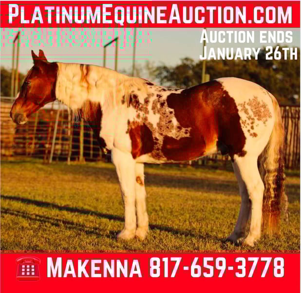 ONLINE AUCTION Place your bids at www.PlatinumEquineAuction.com Starting Bid $3500 Auction ends January 26th, 2025 Need a new saddle? Check out White Rock Saddles on our website or Facebook! Check out this amazing gelding we have had the opportunity to offer to the public, Adios! At only 11 years old, this gelding is ready to find his forever family! Nothing phases this guy as he is always eager to do is job. This horse not only looks majestic, but he rides like it too. Walk, trot, lope, this horse moves like a dream. Slide into the new week knowing that you have an absolute dream of a horse that you can show off to all of your friends. Put Grandpa on him to go check cows, put your husband on him that was reluctant to buy him but is instantly going to fall in love with him or take him to the playdays and let your kids learn on him! Not only is this horse gentle, but he is TOUGH! Need to go check pasture all day? He can do it. Need to go to the long parade where he is going to have to sit all day? He can do it. Want to take the family to the lake and play in the water? Need to have something to unwind with after work? Car broke down and need to go into town to run errands? HE CAN DO IT! Whenever we have a tough hand, we know Adios will always have our back. No matter how busy your life may get, Adios is always ready to saddle up and ride off without a care in the world! He will always meet you at the gate, especially with a little cookie interruption. Located in Lipan Texas. We can help arrange hauling anywhere in the US, Hawaii or Canada! Please call or text Makenna Hartzell 817-659-3778. ONLINE AUCTION Place your bids at www.PlatinumEquineAuction.com Starting Bid $3500 Auction ends January 26th, 2025 Need a new saddle? Check out White Rock Saddles on our website or Facebook!