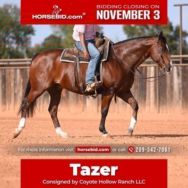 ⚜️𝐓𝐇𝐄 𝐅𝐀𝐋𝐋 𝐇𝐄𝐑𝐈𝐓𝐀𝐆𝐄 𝐂𝐋𝐀𝐒𝐒𝐈𝐂⚜️ Happening now thru MONDAY | NOVEMBER 3rd - Available EXCLUSIVELY on HorseBid's website! For more details and to register visit: www.Horsebid.com CONSIGNOR CONTACT: Coyote Hollow Ranch LLC 209-342-7061 LOCATION: Mount Vernon tx BREED: Quarter horse REGISTERED: No COLOR: Bay HEIGHT: 15.3 AGE: 12 GENDER: Gelding Tazer is the definition of a true and tried ranch horse. This 12-year-old gelding has worked across the country, from the wide-open ranges of Montana and Texas to the big circles in Nevada, handling the toughest terrain and the longest days with ease. He’s been trusted to run yearlings down on a loose rein , doctor cattle outside, and has been tied off on. On top of his ranch credentials, Tazer is also a practice head horse and has been shown in local jackpots, proving he’s quick, smart, and knows his job in the arena. He’s gentle for the family, making him the perfect combination of ranch experience and everyday ride-ability. Tazer is seasoned, proven, and ready for work or play — a horse the whole family can enjoy.