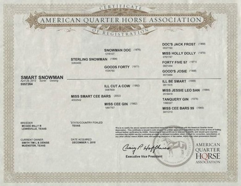 ONLINE AUCTION PLACE YOUR BIDS AT PLATINUMEQUINEAUCTION DOT COM $3500 STARTING BID AUCTION ENDS JUNE 30TH\Let me formally introduce all of you to one of the easiest to ride and versatile geldings you can possibly find on the market today. A Smart Snowman is an 11yr old, 15.1hh, AQHA registered gelding. “Smarty”, as he’s affectionately called, will fit a wide range of riders. Whether you want to go have fun at ranch horse shows, kick it with friends out on the trails, or just enjoy a fun ride in the arena THIS gelding will do the deal. In the arena, Smarty has been shown in most all ranch horse classes for the last eight years. He has a wonderful cadence in all gaits with smooth transitions, turns around easily and correctly, and has a simple change. He is buttery soft in your hands and stays in tune to your seat and legs. On trail courses, bridges, logs, gates, and drags are all a breeze to him and if he questions what’s in front of him he always looks to you for guidance. Outside of the arena, Smarty has been on both group and solo trail rides throughout North Texas and into Oklahoma. He does well going out alone and has no issues leaving the group if you’d like to go do some solo exploring with him. If there is a body of water nearby you’d like to take a dip in, take Smarty with you! This guy absolutely loves cooling off in the water; whether it’s a creek, river, or lake he’s happy to go for a swim. Not only has he been trail ridden, but Smarty also has participated in a local parade through town and grand entries for PRCA rodeos. Smarty has also been used outside for ranch chores such as helping gather and sort cattle as well helping start several horses and one pony mule. He’s lots of fun to ride outside and to work livestock on as he has a ton of natural cowsense which is no surprise after taking a look at his pedigree. Smarty is great to be around on the ground and stands for grooming, fly spraying (both spray bottle & aerosol), bathing, blanketing, saddling, bridling, and for the farrier. He’ll stand at a mounting block if you need assistance into the saddle and will also ride bareback just as easily as he does saddled. Want to show off to your friends? Take the bridle off and go anywhere you want at any speed! Smarty is easy to catch out in the pasture, loads and unloads from a trailer like a champ, and hauls easily. He is UTD on all routine care from vaccinations to his teeth and has a recent vet exam on file which can be found on our website. He’s sound, clean legged, can go barefoot with no issues, requires no maintenance, and will x-ray clean all the way through. Whether you want to hit the show pen, hit the trails, or just want a horse that’s easy to ride everyday of the week he will fit your wants and needs! For additional pictures and information on Smart Snowman you can visit our website www.hspurhorses.com. A link to his YouTube Playlist can also be found there with over an hour worth of videos to be watched. We’re more than happy to help assist with hauling anywhere and invite you to come see Smarty in person at our place in Weatherford, Tx. For any questions and to talk about if Smarty could be the right fit for you, please contact Sarah at H Spur Performance & Versatility Horses 817-366-6123