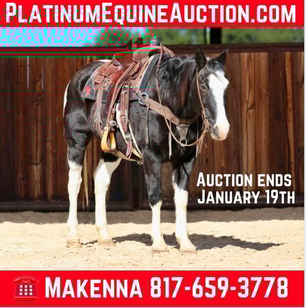 ONLINE AUCTION Place your bids at www.PlatinumEquineAuction.com Starting Bid $3500 Auction ends January 19th, 2025 Need a new saddle? Check out White Rock Saddles on our website or Facebook! Lightening has a heart of gold and is as quiet one could hope to find. Lightning always wants to be your best friend, and is sucker for love and attention. He is a grade 12 year old gelding standing at 14.3hh tall. Lightening is quiet to be around, good with his feet, and a gentleman on the ground. He’s been exposed to almost anything you can imagine including guns, whips, tarps, flags, ropes, or whatever else might look strange to a horse. He wants to ride slow, and relaxed. He picks up both leads nicely and lopes off with ease. Above all Lightning really shines, and excels being out on the trails. He’s calm, steady, and quiet handling himself in rough country, maneuvering with ease over bridges, bogs, crossing water, etc… Lightening has been ridden by all levels of riders, and is forgiving of mistakes made by those who are new, helping to build their confidence. He would really go far in trail versatility classes or would help you to capture the eyes emotions carrying a flag. Whether you’re on the ranch, and in the arena, everyone notices him by his looks, and quiet demeanor. Lightening is located in Lipan, TX. We are more than willing to help with all shipping needs, we ship all over the country as well as Hawaii and Canada. For more information please call Makenna Hartzel 817-659-3778. ONLINE AUCTION Place your bids at www.PlatinumEquineAuction.com Starting Bid $3500 Auction ends January 19th, 2025 Need a new saddle? Check out White Rock Saddles on our website or Facebook!