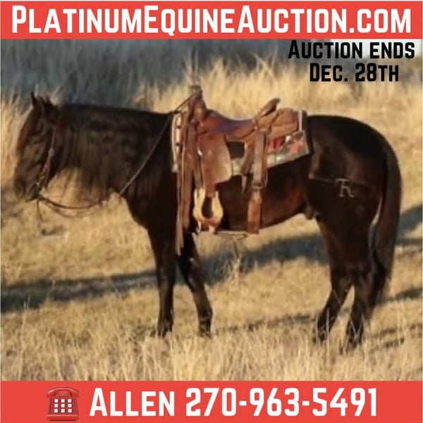 ONLINE AUCTION Place your bids at www.PlatinumEquineAuction.com Starting Bid $3500 Auction ends December 28th, 2025 Need a new saddle? Check out White Rock Saddles on our website or Facebook Alvin is EXACTLY what your family has been asking for! He is the most gentle, easy going, perfect gentlemen everyone is searching for. Alvin is very well trained and is as easy to operate as your car! He is just 12 years old, 14.2 hands tall with a mane for days! Alvin is a horse that is handy enough but calm enough to do any job or anything you ask of him. He is the ultimate kids horse that they can have hours of fun with, and never question their SAFETY. Alvin is perfect for someone wanting to learn or just someone wanting to ride on the weekend down the trails all day long without any trouble whatsoever! He would be a great lesson horse, used for drill team, go ranch on, whatever you need, he is YOUR guy! On a scale of 1 to 10, he’s a 1 on quietness, gentleness and temperament. He is one of those all around geldings that are forgiving enough for those complete beginner riders but he is also fun for an advanced! You can’t go wrong with him for your family! Alvin is very easy, he walks, trots, lopes and side passes very well! He crosses and goes through water like a seasoned pro, he climbs up and down anything you point him too. He does not mind rocky terrain and will go all day long. This horse has no spook to him, what’s so ever, NOTHING phases him. He will keep you and your loved ones safe no matter what, he rides alone or in a group, never buddy sour or barn sour. We can’t say enough good things about him, and believe it or not, there is NOT one bad thing we could say. He is the perfect addition to your family. I could talk about him all day long, or you could come see him for yourself! We are located in ♦️Mineral Wells Texas♦️but have reputable haulers that go all over the country, including Hawaii and Canada. Give me a call or text and I’d be happy to answer any questions! Contact Allen with AM Livestock 270-963-5491 ONLINE AUCTION Place your bids at www.PlatinumEquineAuction.com Starting Bid $3500 Auction ends December 28th, 2025 Need a new saddle? Check out White Rock Saddles on our website or Facebook