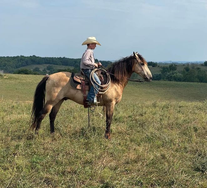 ONLINE AUCTION Place your bids at www.PlatinumEquineAuction.com Starting Bid $3500 Auction ends September 29th, 2024 Need a new saddle? Check out White Rock Saddles on our website or Facebook! Every parent dreams of their kid’s horse to match daddy’s big buttermilk buckskin, right? We’d like to introduce Stoney. He stands 14 Hands and is 12 years old. He is a stunning buckskin gelding with a long mane and tail. We get compliments on him everywhere we go. He is sound, no weave/crib or loading issues. Stoney has been trail ridden all throughout our farms in KY checking fences, gathering pairs, moving young bulls to different pastures and various other jobs. He also rides well in an arena setting. He has that “rocking chair” canter that everyone wants and a smooth trot. We feel that he would be a great step up for a kid or perfect for an adult that is looking for that shorter, reliable trail mount. Stoney is healthy and an easy keeper. He pastures well with other horses and cattle. Stoney is no stranger to our family and has been connected to us the past couple years but is ready for his next person. Please schedule an appt to come meet/ride him. Text or call if anyone has any questions. Located in Maysville, KY. Call Kati Ream 606-407-5747. ONLINE AUCTION Place your bids at www.PlatinumEquineAuction.com Starting Bid $3500 Auction ends September 29th, 2024 Need a new saddle? Check out White Rock Saddles on our website or Facebook!