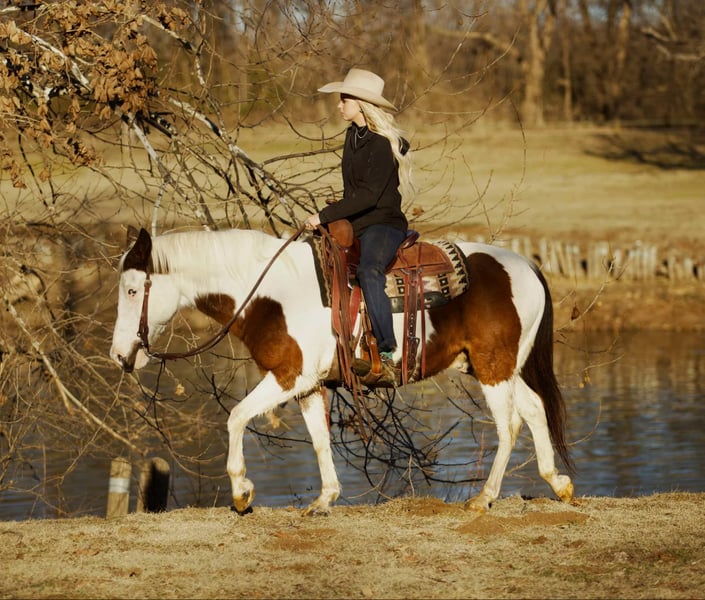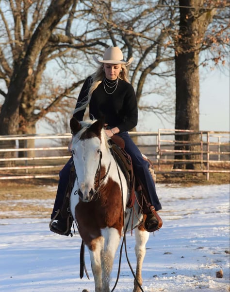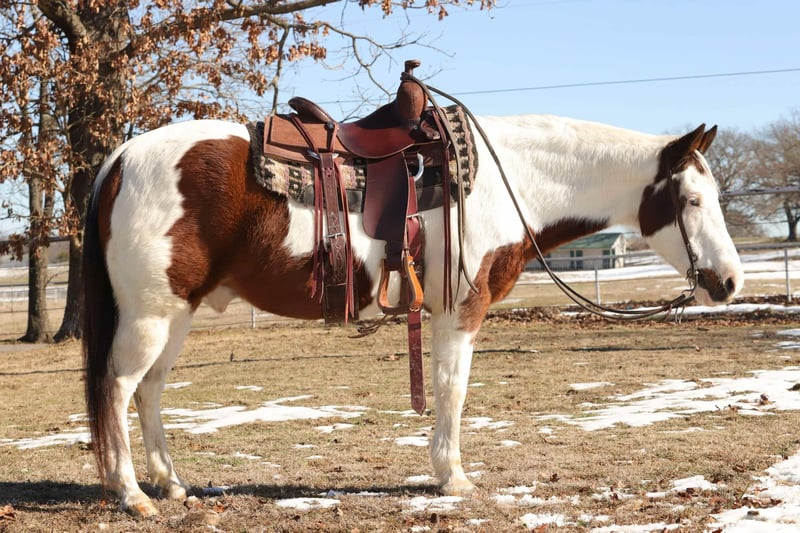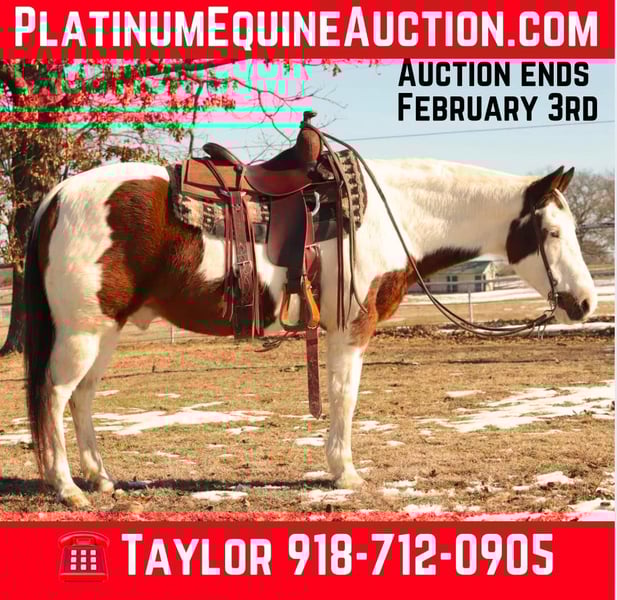 ONLINE AUCTION Place your bids at www.PlatinumEquineAuction.com Starting Bid $3500 Auction ends February 3rd, 2025 Need a new saddle? Check out White Rock Saddles on our website or Facebook! Taco is 13 years old. He stands 14 hands tall and has more color than a crayon box! Taco is a head turner wherever he goes and has been used as a play day pony in the 4-H program the last few years. Taco will go anywhere you point him and is a pleasure to be around. He will cross the logs, ditches, waters, and much more. Taco also loves attention, and is eager to please. He stands tied, loads without hesitation, stands for farrier, and loves baths. He has been around cattle, and all other farm animals. Easy to catch and will meet you at the gate. He has been more miles than most vehicles and ridden by numerous of kids and younger teenagers. Taco has been a great asset to our barn. He has been in multiple parades and grand entry’s including a very large Christmas parade in Oklahoma the last 4 years. Taco has been rode in the arena, will walk, trot, and lope with ease! Absolutely nothing phases him at all. Taco would make a great youth pony or even big enough for an adult! He has lots of life left in him and goes wherever you point him! He is absolutely gentle, honest, quiet and reliable! Shipping is available anywhere in the US also Canada, Mexico, and Hawaii! Located in Sallisaw, OK. Contact TG Livestock Co. Taylor 918-712-0905. ONLINE AUCTION Place your bids at www.PlatinumEquineAuction.com Starting Bid $3500 Auction ends February 3rd, 2025 Need a new saddle? Check out White Rock Saddles on our website or Facebook!