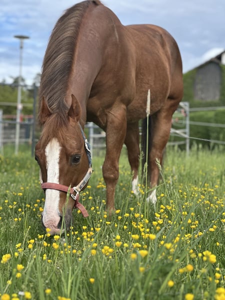 For sale: my American Quarter Horse gelding (registered as a stallion) named Scooter. Scooter is an absolutely reliable teacher for children and teenagers and is also suitable for beginners during training. He never acts out and always tries his best. He is a real cuddler at heart, but he needs some time to build trust. He is well-behaved in the field and in the arena, always following his rider. Scooter is being offered at a significantly reduced price due to an incidental health issue and is therefore being taken out of sport. He has been regularly vaccinated, wormed, and re-shod every 6-8 weeks — going without shoes is not an option! He is excellent for riders seeking a dependable partner for extended trail rides and relaxed leisure hours, providing opportunities to learn and enjoy together. No full livery stables! No dealers! No riding schools! Please feel free to contact me for more information or if you're interested. Viewing and trial rides are possible by appointment.