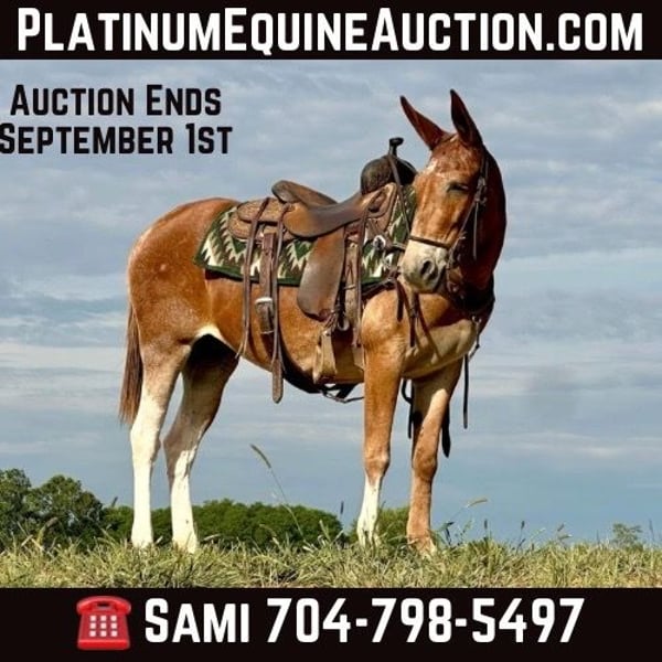 ONLINE AUCTION Place your bids at www.PlatinumEquineAuction.com Starting Bid $3500 Auction ends September 1st, 2024 Need a new saddle? Check out White Rock Saddles on our website or Facebook! Luna is a 12 year old, 15 hand Molly mule. She is excellent on the trails with countless miles ridden. If you point her nose, she will go. She crosses logs, slides down banks, goes through water with ease, and crosses bridges. For the more timid riders, she will follow along with the group and not take a misstep. We have had kids trail riding her and several first time riders that she gave confidence to on the trails. She is traffic safe and has been ridden on the roads. She also does well night trail riding. Headlights and flashlights don’t scare her. Luna won’t be the fanciest broke ranch mule, but she is an honest and safe trail riding mule. We trust her with the kids and any inexperienced guest that wants to ride with us. She rides the same in all situations whether on the trail, down the road, or around camp. She loads and trailers well. She stands for saddling and mounting and is good with the clippers. Luna is an all around really nice mule! For more information, please call Sammi Waugh 704-798-5497 Located in Brooksville, KY. ONLINE AUCTION Place your bids at www.PlatinumEquineAuction.com Starting Bid $3500 Auction ends September 1st, 2024 Need a new saddle? Check out White Rock Saddles on our website or Facebook!