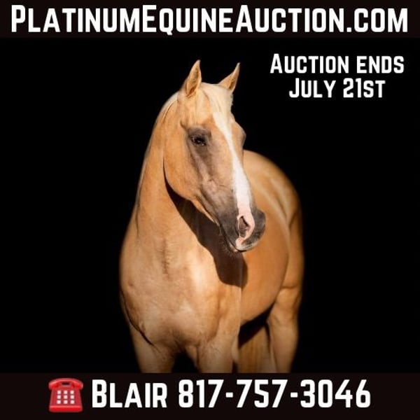 ONLINE AUCTION Place your bids at www.PlatinumEquineAuction.com Starting Bid $3500 Auction ends July 21st, 2024 Need a new saddle? Check out White Rock Saddles on our website or Facebook! “Chico” is a 15H, 12 yr old palomino gelding. If you’re looking for that saint of a horse that you can trust in any new environment or on any new trail, this is your guy! Chico is a very sweet, laid back, go your speed type gelding! He has been primarily used as a trail horse his whole life and has been rode by all ages! He’s easy to handle in all aspects and if you can hold the reins you can ride this one! Chico has recently been used for lessons for all ages! He has zero spook, buck or bolt and has a great go with the flow personality! He tackles all new places and obstacles great! He goes through water and over anything you ask him to! He will ride two handed or neck rein with ease and moves off leg. He goes the speed you ask when you ask him and stops right when you ask him to! Chico is fun to ride and one the whole family will enjoy! He would fit anyone from a beginner to a seasoned horseman and won’t be too boring for the more experienced rider, but he won’t be too much horse for the beginners either! Don’t miss this honest, safe gelding in the color everyone ask for!! He is UTD on teeth and feet. He loads, leads bathes and ties great and gets along with everyone and everything! Go to his website page northtexashorsecompany.com/chico for more pictures and footage! Please call Blair with North Texas Horse Company for more info at 817-757-3046. We are located in Weatherford, TX and can help arrange affordable shipping to anyone!! ONLINE AUCTION Place your bids at www.PlatinumEquineAuction.com Starting Bid $3500 Auction ends July 21st, 2024 Need a new saddle? Check out White Rock Saddles on our website or Facebook!