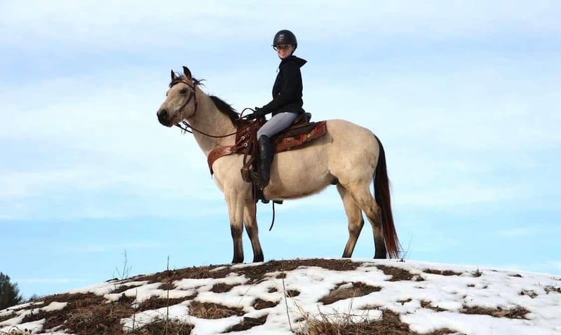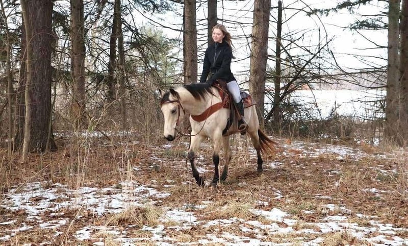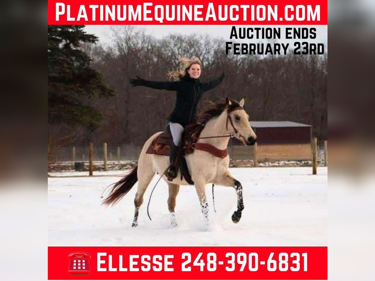 ONLINE AUCTION Place your bids at www.PlatinumEquineAuction.com Starting Bid $3500 Auction ends February 23rd, 2025 Need a new saddle? Check out White Rock Saddles on our website or Facebook! What’s better than butter?? Not much! This 13 year old 14.2hh stout made buttermilk buckskin gelding has it all. He shines like a diamond when the sun hits him! He’s a stunning buttermilk buckskin gelding with a nice mane and tail. Butter is the type of horse that anyone can hop on and enjoy! He rides English, western, and bareback with any bit or with just a halter and lead rope. You can ride him in the arena, out on the trails, or in the wide open field. He walks, trots, and canters with easy. His canter is absolutely delightful to sit on. Butter is eager to please and is a quick learner. He has yet to say no to anything we ask of him. Butter is not the spooky type. He remains cool, calm, and collected in any new situation and place we take him. He has countless of trail miles under his belt. There’s nothing he loves more than to explore the wilderness with his rider. You can take him out alone or in a group. He’s seen it all from logs, mud, tall grass, rocks, puddles, turkeys, deer, and anything else you could think of encountering out in the woods. He walks down the trail path on a loose rein and will go wherever you point him. On the ground he’s easy to catch and lead. His manners are A+ Butter stands well in cross ties or tied to a post while grooming and tacking. For a few years Butter lived in a families backyard. During that time he gave pony rides to kids as young as 3 years old around a trampoline, swing-set, sandbox, and many other toys. Butter is also traffic safe as he has been ridden down a busy road to the apple orchard. Nothing phases this guy! He’s a great all around gelding that will do anything you ask of him! Butter lives in Howell Michigan! Contact Ellesse Schwartz for more information 248-390-6831. ONLINE AUCTION Place your bids at www.PlatinumEquineAuction.com Starting Bid $3500 Auction ends February 23rd, 2025 Need a new saddle? Check out White Rock Saddles on our website or Facebook!