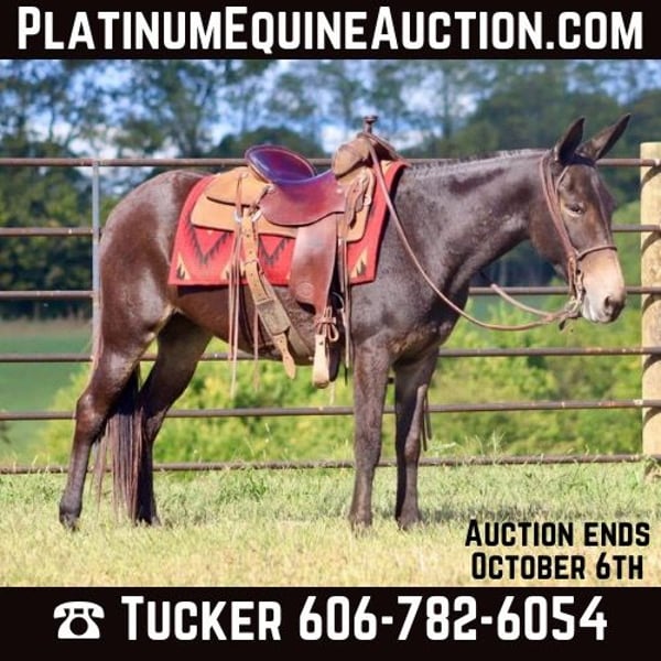 ONLINE AUCTION Place your bids at www.PlatinumEquineAuction.com Starting Bid $3500 Auction ends October 6th, 2024 Need a new saddle? Check out White Rock Saddles on our website or Facebook! Juli is a 14.1 hand 12 year old Molly mule. She is a ride and pack mule that loves the trails. Juli has lots of miles in the deep south trail riding. She’s also been a hog and coon hunting mule. She is good with the hounds and rides at night with no problems. She’s packed out coons and squirrels with no problems. Juli has been on overnight camping trips and ties out on the high line with no problems. She loads and hauls well. She does the best following or being in the middle of the pack, but she will lead if you need her to. She rides out alone as well. She’s good to check cattle. Handles her feet and ears nicely. Juli is just an all around good, using type of mule. For more information, call Brookside Horses Tucker 606-782-6054 Located in Brooksville, KY. ONLINE AUCTION Place your bids at www.PlatinumEquineAuction.com Starting Bid $3500 Auction ends October 6th, 2024 Need a new saddle? Check out White Rock Saddles on our website or Facebook!
