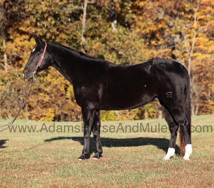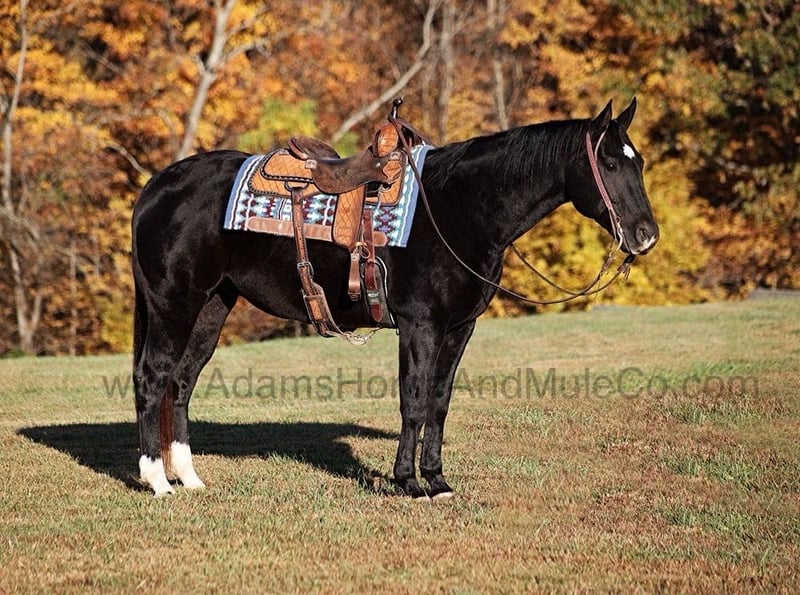 Go to www.AdamsHorseAndMuleCo.com for more pics and a video. AHAMC has been in the horse business and sold horses over the internet since 2005. We have a long track record of success with hundreds of happy customers. We work hard to match riders with the correct horses and specialize in beginner safe, family friendly horses that have been used and checked out by our family! Color Me Black aka Blackie is a well built jet black gelding standing 15.2hh. He is a 2012 Model registered in the AQHA with a good pedigree. Blackie has been used around the ranch checking cattle and he has roped and doctored several as well. He knows all about ranch work and is prepared to help you anytime that the situation calls for it! Blackie loves to just cruise along slow and easy down the trails and he is a horse that the whole family can ride and enjoy! He is an excellent trail horse and has been ridden in multiple states. He will cross creeks, ditches, logs and navigate rough rocky areas. He is safe riding in traffic. He has a smooth jog, a nice lope, has a good stop, turns a circle both ways and backs with ease! Blackie is a confident horse on the trails and will lead the crew or head out alone with no issues! He has been exposed to all kinds of wildlife such as deer or turkey and will go anywhere that he is asked too. He has been ridden many miles in the mountains of Eastern Kentucky and encountered every obstacle possible on the trail. He will go up or down even the steepest slopes, across deep creeks, over downed trees, and over all types of rough terrain while still being sure footed. Blackie is not cinchy, cold backed, does not crib or weave. Blackie is a horse that anyone would be proud to own and one that anyone will love!!! Feel free to call Eric 606-308-2461 with any questions.