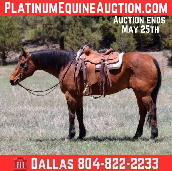 ONLINE AUCTION Place your bids at www.PlatinumEquineAuction.com Starting Bid $3500 Auction ends May 25th, 2025 Need a new saddle? Check out White Rock Saddles on our website or Facebook! Blake is a grade 14 year old gelding standing 14.2hh. This magnificent gelding is the true definition of versatile. Very very broke, good minded, gentle, and will go absolutely any direction you point him! Whether you’re 5 years old or 75 years old Blake will take absolutely great care of you, being the same exact horse every ride no matter how long he’s sat. We’ve used Blake all over the ranch doing absolutely every job possible, as well as competed in various team penning events. With a very fancy handle, great mind, solid attitude, and gentle disposition, Blake is sure enough to fit absolutely anybody no matter what you decide to do with him. Surefooted, easy going, and solid out on the trails. Flowing water, thick brush, rough steep terrain, you name it and Blake will mosey right on through it. Blake is an absolute blast in the arena as well. Fancy neck rein, rocking horse lope, and a tremendous stop. If you’re looking for a good ol using horse, your next adventure buddy, or a well rounded gelding to go compete on Blake will be the guy for you!! Blake is easy to catch and good to groom, saddle, bridle, bathe, shoe, and load. Will come with a clean coggins and health! Transport can easily be arranged anywhere in the US!!! Located in Camp Verde, AZ. Contact D/C Equine Services Dallas 804-822-2233 with any questions. ONLINE AUCTION Place your bids at www.PlatinumEquineAuction.com Starting Bid $3500 Auction ends May 25th, 2025 Need a new saddle? Check out White Rock Saddles on our website or Facebook!
