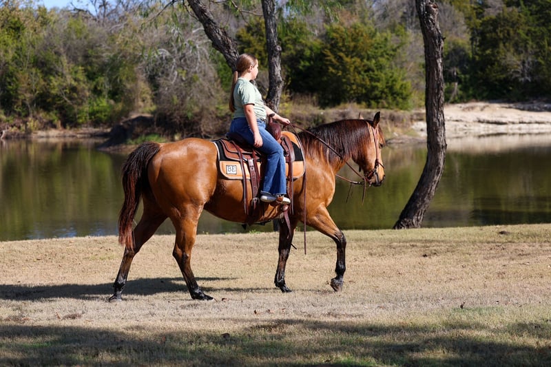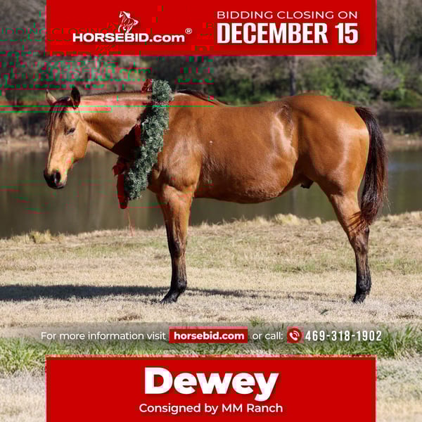 🎄𝐓𝐇𝐄 𝑯𝒐𝒍𝒊𝒅𝒂𝒚 𝐂𝐋𝐀𝐒𝐒𝐈𝐂🎄 Happening now thru MONDAY | DECEMBER 15th - Available EXCLUSIVELY on HorseBid's website! For more details and to register visit: www.Horsebid.com CONSIGNOR CONTACT: MM Ranch 469-318-1902 LOCATION: Forney ,TX BREED: APHA Quarter Horse REGISTERED: Yes REGISTERED NAME: GONNA BE BLUE COLOR: Buckskin HEIGHT: 15 AGE: 14 GENDER: Gelding Dewey is a registered buckskin gelding!!! Yes a registered 14 yr old all around ranch gelding!!! He’s got that color everyone loves. Registered name is “GONNA BE BLUE”. He is 15 hands tall. You don’t see them like this everyday. 👉🏼 This is a classy, well broke, and smart horse. We cannot express enough how great he has been for all riders that have rode him. He simply makes Horse Riding FUN. 🌾You can catch Dewey in 100,000 acre pasture. He will walk right up to you. This is a kind very willing to please type that anyone can ride and get along with. He will do anything you ask him to do. From beginner to advanced. He has one of those willing to please type attitudes. He is always happy and ready to do whatever. He is so easy to handle and be around. 🐂 He has been used on the ranch to check cattle, fences, rope and doctor sick calves. He is a tried and true solid ranch horse. With all the fancy buttons. You can even back him in the box and rope off of him. He has a lot of cow sense and ability. He can go do anything you want him to do. And the best part is he super quiet and gentle. And stays that way year around. 🦖Throw the husband, the kids, or your non-horsey friend on him and know they will be safe and have a great ride!!!! After a long day at work you can home and just enjoy riding him around the house. Or load him up and take him on a weekend camping trip through the trail or rough, rocky terrain, and camp out. He does perfect on overnight camping trips. He requires no prep, just load up and go! He crosses water, bridges, he has been around exotic animals. He will go out alone on trails too. Not at all barn soured or buddy soured. Absolutely nothing brothers this horse. He is as laid back as they come. 💥Absolutely no buck or bad habits. Don’t let this amazing gelding get away from you if you are wanting something dependable. ⚡️He sells 100% safe and sound in every way. 🌎 We can help with making shipping arrangements.