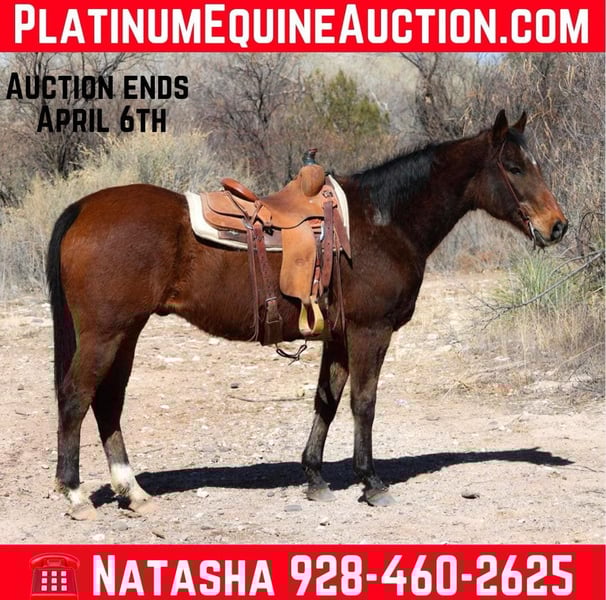 ONLINE AUCTION Place your bids at www.PlatinumEquineAuction.com Starting Bid $3500 Auction ends April 6th, 2025 Need a new saddle? Check out White Rock Saddles on our website or Facebook! Cash is a grade 14 year old gelding standing 15.1hh. This stout made, dense boned and rock footed gelding is as gentle as they come!! Cash has been used around the ranch and has seen tons of miles and lots of long days. This nice easy going gelding will mosey on down the trail with absolutely no spook or buck, and will never get fresh. Rough rocky county, steep slippery slopes, flowing water, fallen logs, thick brush, flowing traffic in town, you name it and Cash will mosey on through it. This magnificent gelding will also walk, trot, and lope both ways with ease as well as neck and has a good stop. Whether you’re looking for a good trail horse or one to play around in the arena, Cash is your guy!!! Cash is easy to catch and good to groom, saddle, bridle, bathe, and shoe! Will come with a clean coggins and health!! Transport can easily be arranged anywhere in the US!! Located in Camp Verde, AZ. D/C Equine Services Dallas 804-822-2233 or Natasha 928-460-2625 Located in Camp Verde, AZ. ONLINE AUCTION Place your bids at www.PlatinumEquineAuction.com Starting Bid $3500 Auction ends April 6th, 2025 Need a new saddle? Check out White Rock Saddles on our website or Facebook!