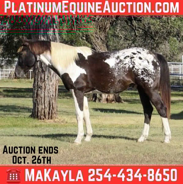 ONLINE AUCTION Place your bids at www.PlatinumEquineAuction.com Starting Bid $3500 Auction ends October 26th, 2025 Need a new saddle? Check out White Rock Saddles on our website or Facebook Apache is a wonderful Pintaloosa, that’s a versatile horse, who’s perfect for riders looking for a safe and reliable partner. At 14 years old and standing 15.1 hands tall, he excels on the trails, in western riding, and can even handle some English riding as well. He’s been used by an older lady for the past three years to ride around her property, making him a calm and steady horse with plenty of experience. Apache is super easy to handle—he will stand still for mounting and is ready to go right off. He’s been used for lessons in both Western and English riding styles, so he’s comfortable and well-trained in both disciplines. Because of his gentle nature and training, Apache would make a great starter horse for someone new to riding or looking to build confidence. Apache is super easy to saddle, stands wonderful for the farrier, and loads/unloads like a champ. He checks all the boxes for any family or beginner looking for a pretty and safe boy! If you want a safe, dependable, and versatile horse who’s ready to be your next riding partner, Apache is the perfect choice. Come see him for yourself or we can schedule a FaceTime to meet him! Call or text Makayla with MW Horses at 254-434-8650. Need hauling? We got a list of reliable haulers around the US! ONLINE AUCTION Place your bids at www.PlatinumEquineAuction.com Starting Bid $3500 Auction ends October 26th, 2025 Need a new saddle? Check out White Rock Saddles on our website or Facebook