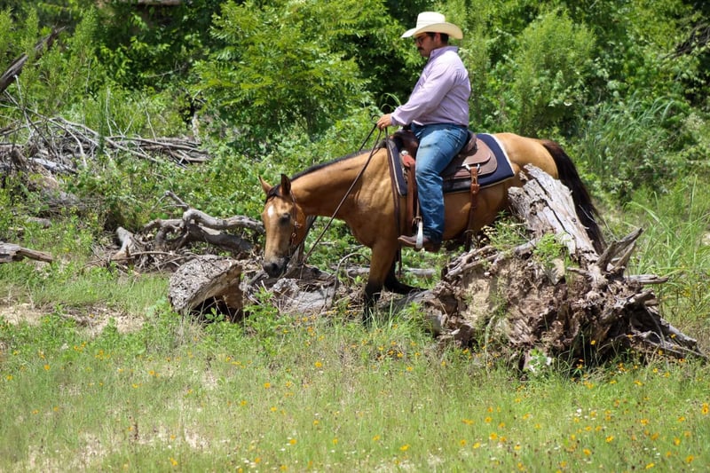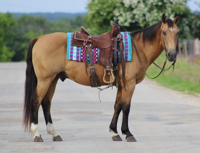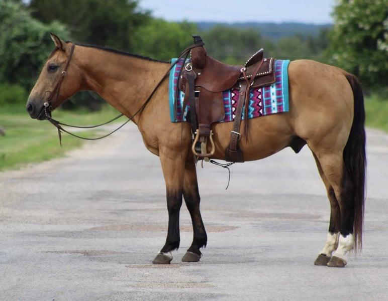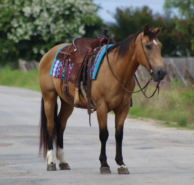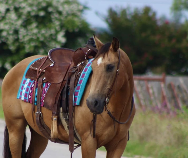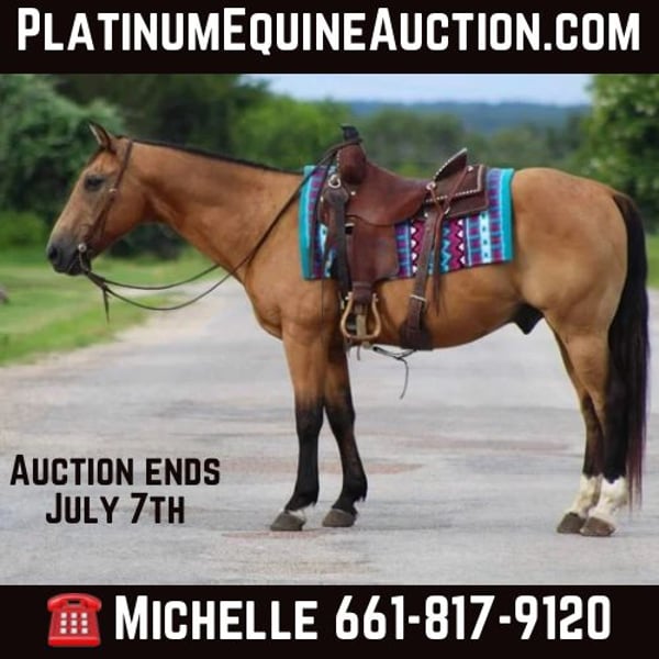 ONLINE AUCTION Place your bids at www.PlatinumEquineAuction.com Starting Bid $3500 Auction ends July 7th, 2024 Need a new saddle? Check out White Rock Saddles on our website or Facebook! Let me introduce to you the one and only “Billy Bob” he is a 14 year old buckskin gelding standing 14.1 hds tall . He is absolutely 100% user friendly and you don’t have to be an expert horseman to ride him . He is SAFE for all levels of riders from the first time beginner to the most experienced horseman out there , everyone enjoys taking him for a spin . We have gave countless lessons on him from the littles all the way up to the adults . Billy Bob has a sweet , loving old soul to him and is happy to do whatever you ask of him. He loves to go out and explore the trails . He is confident and brave all while taking care of his rider . He has seen many miles of trails from the busy city streets to the quiet mountains. He will walk out down the trail all day long on a loose rein and is happy to do it . Billy Bob will cross bridges , water , logs , tarps and brush with no issues at all . He has seen many wildlife out on the trails and doesn’t bat an eye . He will walk , trot and lope beautiful circles in the arena as well . Always picks up the correct leads , he has a smooth little short lope to him . He is always laid back , easy going , definitely a more whoa than go type of dude but not one you have to peddle along , leave him off for 6 months and he will be the same horse every time . He is absolutely a in your pocket type of horse, he loves attention and will stand there all day long for you to groom and love on . He has excellent ground manners , easy to catch in the pasture , stands for the farrier , loads and unloads off the trailer with no issues. If you need help with transport don’t hesitate to ask we have a list of reputable haulers that can get him safely to your doorstep world wide. Located in Stephenville, TX. Contact M$ Performance Horses Michelle 661-817-9120. ONLINE AUCTION Place your bids at www.PlatinumEquineAuction.com Starting Bid $3500 Auction ends July 7th, 2024 Need a new saddle? Check out White Rock Saddles on our website or Facebook!