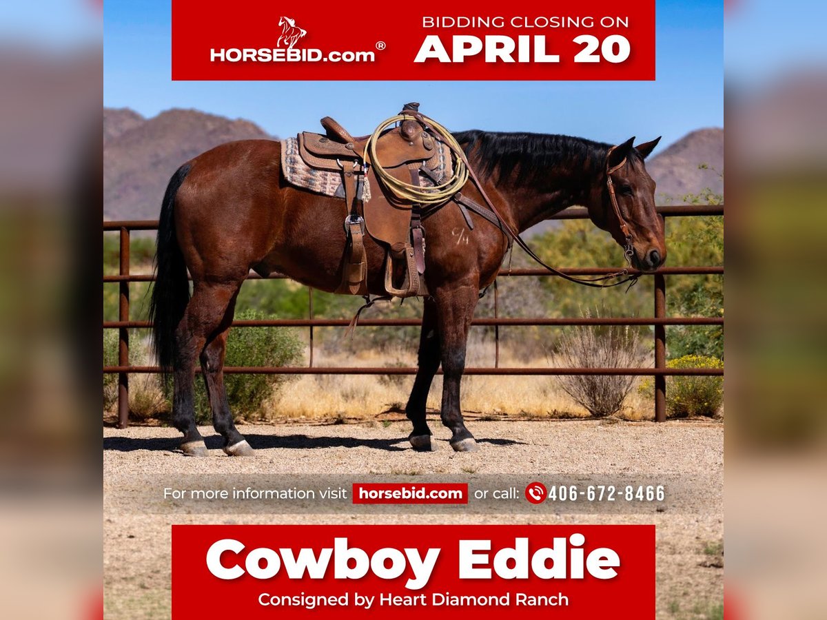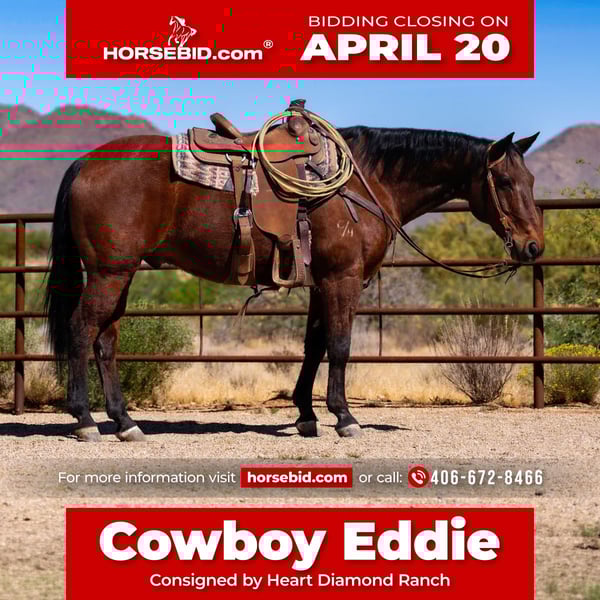 ⚜️𝐭𝐡𝐞 𝓔𝓵𝓲𝓽𝓮 𝐒𝐩𝐫𝐢𝐧𝐠 𝐂𝐥𝐚𝐬𝐬𝐢𝐜⚜️ Happening now thru MONDAY | APRIL 20th - Available EXCLUSIVELY on HorseBid's website! For more details and to register visit: www.Horsebid.com CONSIGNOR CONTACT: Heart Diamond Ranch 406-672-8466 LOCATION: Congress, Arizona BREED: AQHA REGISTERED: Yes REGISTERED NAME: Eddie Wayne Junior COLOR: Bay HEIGHT: 15 AGE: 19 GENDER: Gelding Cowboy Eddie – 2007 Bay Gelding If you’re looking for a seasoned, dependable head horse, Cowboy Eddie is the kind. Eddie is solid in the box, scores consistently, and has been through a barrier. He knows his job, making him a great fit for a wide range of ropers. He’s been ridden and hauled by a 78-year-old man and roped on by a 72-year-old lady. Eddie has also been hauled to high school rodeos and has an NTR Champion title to his name. He’s experienced, seasoned, and ready to keep going.