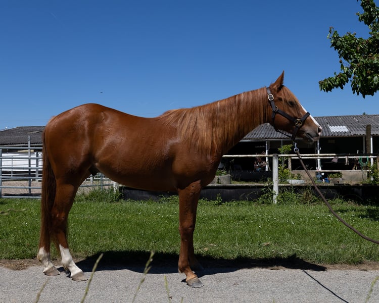 For sale (on behalf) is this handsome 2-year-old QH gelding "RN DIAMOND JOY," nicknamed "Diamond." He currently stands at 147cm and is sure to grow taller. His long legs already indicate this! He has very nice movements, is quick, and shows himself to be very balanced in both trot and canter for his age. He is naturally barefoot and is currently learning the basics for foals/young horses with us. He is familiar with: - Standing tied - Giving hooves - Showering - Grooming - Saddling - Groundwork - Walking - Trail riding as a lead horse - Farrier He is super sweet to handle and has an extreme will-to-please. He is available for viewing and will surely make a very reliable partner, whether for sport or leisure. He has AQHA papers, a 7-panel test, and an equine passport. Videos of him in motion can be sent upon request.