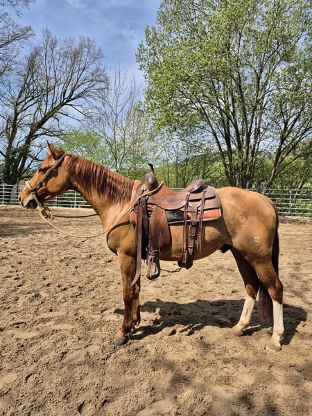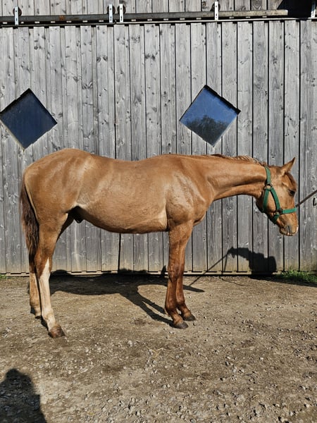 Cookie 2- feiner Wallach in der Sonderfarbe red dun. Ruhig im Umgang. Richtig entspanntes Pferd. Klarer Kopf. Tolle Bewegungen. Rinderarbeit kein Problem. Wächst im Herdenverband auf. Opa erfolgreich im Cutting Sport (Peptoboonsmal). Super Abstammung. Für den Sport geeignet und natürlich auch für ambitionierte Freizeitreiter. Beide Elternteile 5 Panel N/N. **Das Betreten des Hofes und der Weiden des Betriebes für Besichtigungen sowie das Reiten von Verkaufspferden erfolgt immer auf eigene Gefahr! Ausschluss jeglicher Gewährleistung! Für das Probereiten unserer Verkaufspferde berechnen wir 50€. Dieser Betrag wird beim Kauf eines Pferdes wieder verrechnet.**