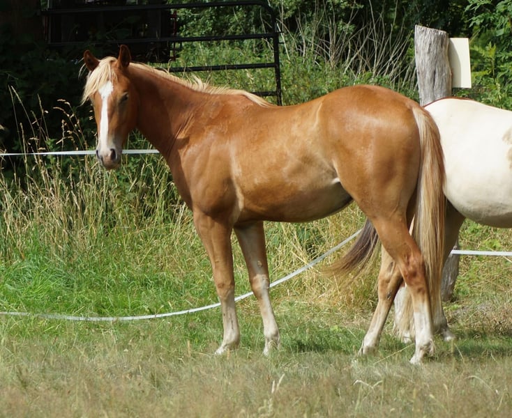 One Shiney Time aka Robbie ist ein wunderschöner QH Wallach von One Shiney Treat einem direkten Shining Spark Sohn. Robbies Mutter ist eineOne Time Pepto Tochter, also feinstes Cuttingblut.. Robbie ist korrekt gebaut, seine Bewegungen sind sehr athletisch und katzenhaft. Er zeigt spielerisch sein Talent für Stopps, Turns und Galloppwechsel. Er ist zur Zeit angeritten und ist sehr sensibel und fein. Sire: One Shiney Treat by Shining Spark / Grays Starlight Dam: Escada Be One Time by One Time Pepto/Shorty Lena 06/2023, 5panel n/n, IMM n/n Unsere Fohlen wachsen im Herdenverbund mit Fohlengesellschaft auf und sind regelmäßig entwurmt und dem Hufschmied vorgestellt. Mehr Info unter www.brallentin-quarterhorse.de