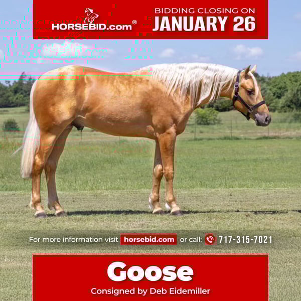 𝐉𝐀𝐍𝐔𝐀𝐑𝐘 ⭐️𝑨𝒍𝒍 𝑺𝒕𝒂𝒓 𝑳𝒊𝒏𝒆𝒖𝒑⭐️ Happening now thru MONDAY | JANUARY 26th - Available EXCLUSIVELY on HorseBid's website! For more details and to register visit: www.Horsebid.com CONSIGNOR CONTACT: Deb Eidemiller 717-315-7021 LOCATION: Whitesboro, TX BREED: QH REGISTERED: Yes REGISTERED NAME: Smart Out Chic COLOR: Palomino HEIGHT: 15 AGE: 3 GENDER: Gelding If you are in the market for a standout looker for this Futurity season, look no further. “Goose” is a gorgeous Palomino gelding guaranteed to turn heads no matter what direction you take him in. He is sired by the great “Tricked Out Spook” ($71,803 LTE) who has a sire earning of $815,911, producing Reiners, Ranch Riders and Reined Cow Horses. His dam is a granddaughter of the great Smart Chic Olena. "Invitational Futurity and 100X Stakes Eligible, NRHA & NRBC Enrolled, Eligible for NARS & All Star Enrollment." Goose is a beautiful golden Palomino with a long white mane and thick white tail. He is a solid built 15 hands with correct conformation, pretty head and great mind. He comes out every day quiet and ready to do his job. He has been in training most of the year with Francesco Martinotti and has a strong foundation with spins, circles, lead changes and a BIG stop. He is a very pretty mover with lots of cadence and smooth to ride. He is “Invitational Futurity & 100X Stakes Eligible, NRHA & NRBC Enrolled, Eligible for NARS & All Star Enrollment”. He is only being sold due to the owner changing disciplines. Goose has endless possibilities in or out of the arena. Chase your dreams in the NRHA pen, make him a standout Ranch Riding horse or just admire his beauty on the trails. He is quiet enough to be a Youth or Non-Pro horse. We can’t say enough good things about him. Goose comes with clean X-rays and we welcome anyone to come meet him and try him out. You won’t be disappointed. UTD on all vaccinations. Nationwide shipping can be arranged. Feel free to reach out to Francesco Martinotti at (903)820-6457 or Deb at (717)315-7021.