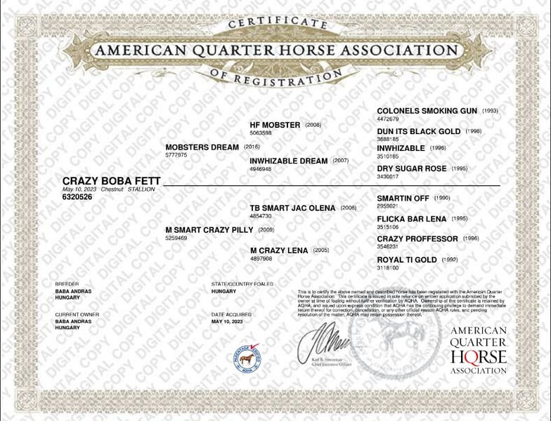 Propiedad y gestión profesional por parte de un veterinario, ha sido mantenido en un estado de salud excelente, con cuidados regulares de herrador y veterinario. Es fácil de manejar en tierra, se queda tranquilo para el herrador y trabaja de manera confiable en la cuerda de lunging. Su carácter amistoso y sociable hace que sea un placer tenerlo cerca, tanto con personas como con otros caballos. Sus patas y cascos están en condiciones excelentes, respaldadas por un cuidado constante de herrador, y cuenta con radiografías limpias de los cascos delanteros. Además, tiene un test de 5 paneles negativo, asegurando total transparencia sobre su estado de salud y sanidad. Toda la documentación, incluido su pasaporte y papeles AQHA, está en orden. Este potro es un compañero confiable y bien cuidado, listo para encontrar un nuevo hogar. (Barato porque, soy jinete de salto, no sé nada de caballos western, pero mi padre es veterinario equino y le encanta criarlos.)