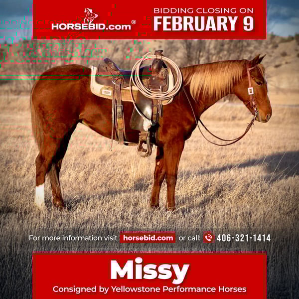❤️🔥𝑩𝒆 𝑴𝒊𝒏𝒆 𝐒𝐄𝐋𝐄𝐂𝐓❤️🔥 Happening now thru MONDAY | FEBRUARY 9th - Available EXCLUSIVELY on HorseBid's website! For more details and to register visit: www.Horsebid.com CONSIGNOR CONTACT: Yellowstone Performance Horses 406-321-1414 LOCATION: Greycliff, MT BREED: Quarter horse REGISTERED: Yes REGISTERED NAME: MISS CATTASTIC COLOR: Sorrel HEIGHT: 14.2 AGE: 4 GENDER: Gelding Missy AQHA “MISS CATTASTIC” “Metallic Cattatck” X “Miss Nita Red Pep ” Incentives, eligible for Ruby Buckle, Riata Buckle, NRCHA Stallion Stakes, Royal Crown Stallion Incentive, AQHA/APHA Double Registered, Breeder's Invitational and Chrome Cash! Take a look at this pretty mare! She checks all the boxes for someone in the market for an outstanding rope prospect! She has all the basic buttons, will and talent to win in the roping arena! She has been worked on the flag and moves smoothly and quickly! She has seen the feed lots and sale yards pushed both cattle and horses! Has a good foundation in the arena and is ready to be polished up and taken in any direction! Easy to catch, be around, good to shoe and light and soft to ride! Located here at the ranch in Greycliff Montana! Call or Text with any questions @ (406)321-1414.