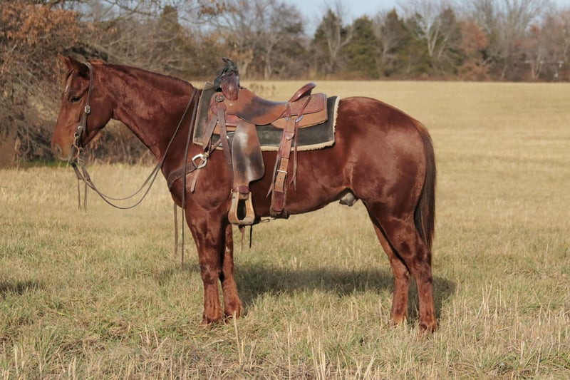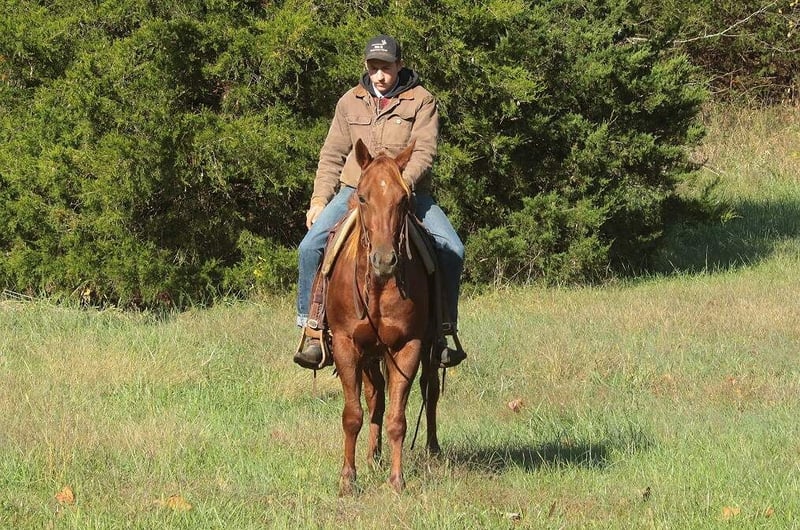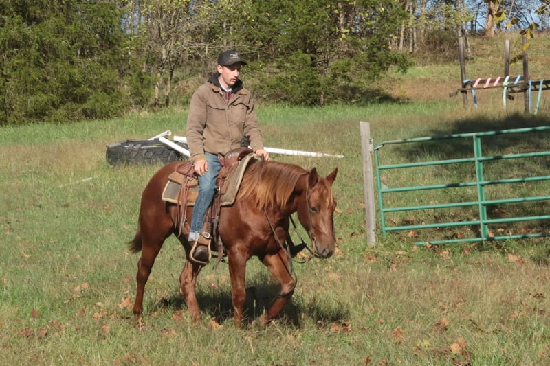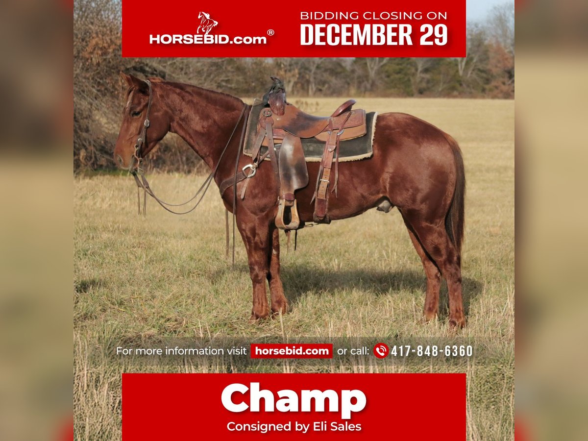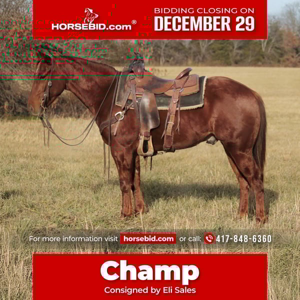 ⚜️𝐓𝐇𝐄 𝓗𝓮𝓻𝓲𝓽𝓪𝓰𝓮 𝐖𝐢𝐧𝐭𝐞𝐫 𝓒𝓵𝓪𝓼𝓼𝓲𝓬⚜️ Happening now thru MONDAY | DECEMBER 29th - Available EXCLUSIVELY on HorseBid's website! For more details and to register visit: www.Horsebid.com CONSIGNOR CONTACT: Eli Sales 417-848-6360 LOCATION: Mt. Vernon, MO BREED: Quarter Horse REGISTERED: No COLOR: Sorrel HEIGHT: 14.2 AGE: 3 GENDER: Gelding Champ is 3 year old sorrel quarter horse gelding with a sweet disposition and a calm, willing attitude. With no buck, kick, rear or bite on top of his in your pocket personality he’s the kind of young horse that’s a pleasure to be around—gentle, quiet-minded, and easy to handle both on the ground and under saddle. Champ has been used extensively outside to gather cattle, drag calves in the branding pen and to take leisurely trail rides as well as countless days in the stockyards opening and closing gates, sorting cattle and pushing them down the alley. No matter what you find in your path whether it’s rough rocky terrain, mud, brush or even the need to swim across the river, Champ will cross whatever you point him at without hesitation. Champ rides amazing with no buck, kick, rear or bite, moves out smoothly, and takes everything in stride. Champ has good ground manners, stands patiently for grooming, saddling and the farrier. Champ is very respectful and easy to catch whether he’s in a stall or turned out in the pasture he is guaranteed to be in your pocket asking for a treat. He has a solid foundation and the mind to continue learning without fuss. With his attractive sorrel color, sturdy build, and laid-back personality, Champ will make a great partner for a youth, amateur or experienced horseman looking to take him an any direction they choose. Whether you’re looking for a future ranch, trail, rope or all-around horse, Champ has the temperament and potential to excel. If you’re searching for a gentle young gelding that is 100% sound with a great mind and a bright future, Champ is the gentleman you’re looking for.