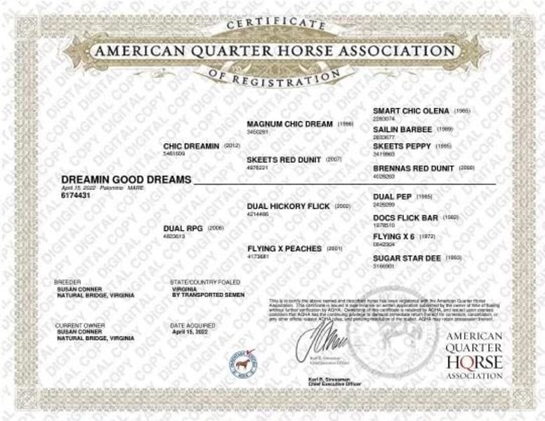 ONLINE-AUKTION Geben Sie Ihre Gebote unter www.PlatinumEquineAuction.com ab. Startgebot $3500 Die Auktion endet am 21. Juli 2024 Brauchen Sie einen neuen Sattel? Schauen Sie sich White Rock Saddles auf unserer Website oder Facebook an! Wenn Sie auf dem Markt für einen schönen Anwärter sind, dann schauen Sie sich Dreamin Good Dreams an, eine 14,3h, 2022 Chic Dreamin Stute! Sie ist ein wunderschönes, kräftiges Palomino-Stutfohlen, das alle Blicke auf sich ziehen wird. Sie hat einen schönen, sanften Start mit dem Reining-Griff hinter sich und sollte sich in den Ranch-Versatility-Klassen auszeichnen. Sie hat ein 6-monatiges professionelles Reining-Training mit Max Morin absolviert und ist immer noch bei ihm in Aubrey, TX, im Training. Sie hat auch einen vollständigen Satz von sauberen Röntgenbildern. Dieses süße Stutfohlen beweist, dass sie einen super Verstand, ein ruhiges Gemüt und eine angenehme Einstellung hat. Sie geht jeden Tag gerne zur Arbeit und scheint sich durch nichts aus der Ruhe bringen zu lassen. Sie reitet draußen auf der Ranch ohne Probleme, überquert Stangen, geht seitlich vorbei, zieht einen Baumstamm und lässt sich sogar ein Seil vom Rücken werfen. Sie ist auch als Kuhpferd gezüchtet, für alle, die das in ihren Lebenslauf aufnehmen wollen. Die Tatsache, dass sie gut gebaut ist, trägt dazu bei, dass diese hervorragende Stute noch nie Probleme mit der Gesundheit hatte und keine Pflege benötigt. Sie ist ein pflegeleichtes Pferd ohne Laster und mit ausgezeichneten Manieren. Machen Sie sie fertig und machen Sie sie zu dem besonderen Pferd, das Sie schon immer haben wollten. Kontaktieren Sie Max Morin 615-710-4486 bei Fragen. Gefunden in Aubrey, TX. ONLINE-AUKTION Geben Sie Ihre Gebote unter www.PlatinumEquineAuction.com ab. Startgebot $3500 Die Auktion endet am 21. Juli 2024. Brauchen Sie einen neuen Sattel? Schauen Sie sich White Rock Saddles auf unserer Website oder Facebook an!