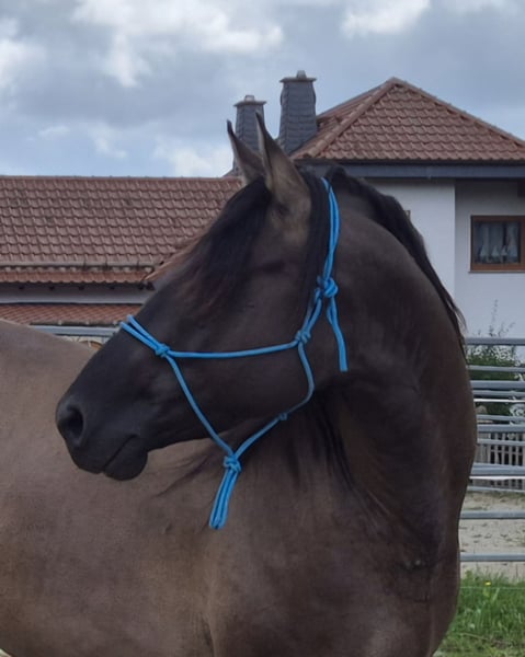 "MAGIC STEELDUST": Un tipo davvero cool. È nato a giugno 2024 e attualmente si trova al pascolo con il suo amico "Faust". Ad aprile 2025 è stato castrato, per facilitare la ricerca di una nuova famiglia. Dusty cerca un nuovo ambiente, preferibilmente in un bel gruppo. Dusty è buckskin e con una straordinaria e bella marcatura sul viso, è un sogno di cavallo. Inoltre, Dusty è dotato di una meravigliosa spalla inclinata per movimenti ampi, così come di un posteriore super potente per manovre agili e leggere. Promette di diventare un compagno sportivo entusiasta. La sua struttura assolutamente corretta e una buona base offrono le migliori condizioni per una vita lunga e sana da cavallo. Si prevede che raggiunga, come i suoi mezzi-fratelli, un'altezza finale di circa 154 cm. Per carattere è molto tranquillo e forte di nervi, va bene anche da solo dal pascolo, è addestrato al guinzaglio e dà i piedi - quindi è addestrato in base alla sua età. Il padre: Hossa Dunit Maxen è un Grullo, la madre: Hollywood Blue Ice è Perlino. Il certificato di registrazione è già disponibile in originale. Prezzo 6.800 € trattabili - è ancora il prezzo da puledro - vale la pena vederlo! Si prega di chiamare o contattarci semplicemente al numero di cellulare 015780273780. E venite a trovarci volentieri in Rhön.