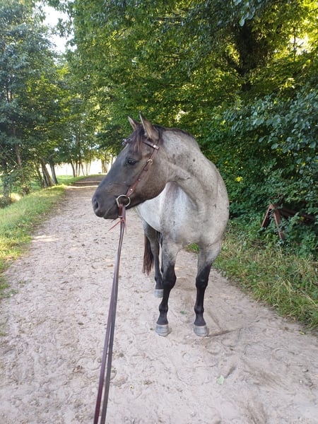 4-year-old Quarter Horse gelding in Grullo Roan for sale. He has a calm, fearless temperament, is backed and very well-behaved under saddle. He goes out alone into the countryside. He is used to being kept in an open stable and is very sociable. He is barefoot, has been regularly vaccinated and dewormed, and had his teeth done. He has a small cosmetic flaw on his right eye, which does not cause any problems. A horse to love and to train yourself! Unfortunately, I do not have the time to further develop him.