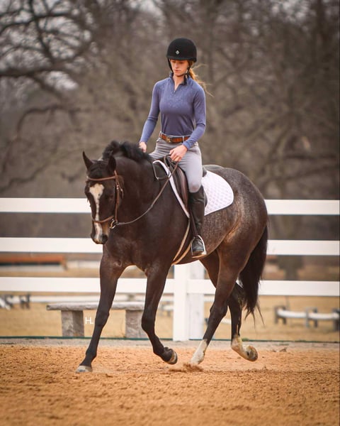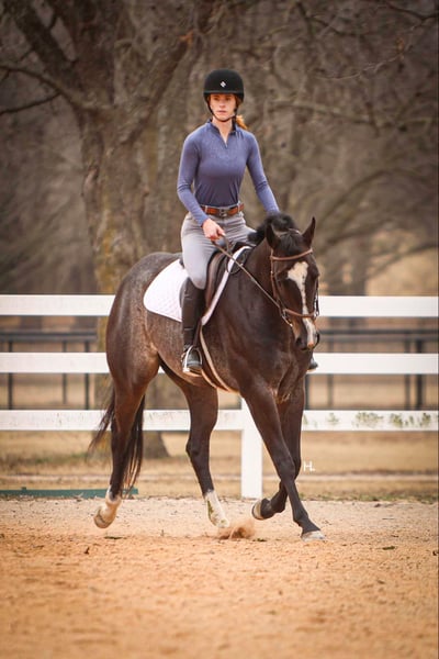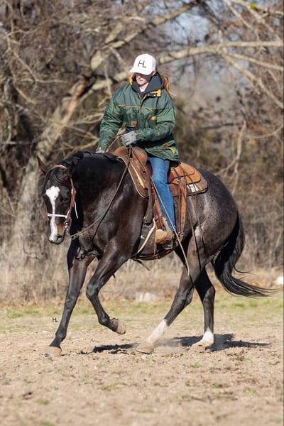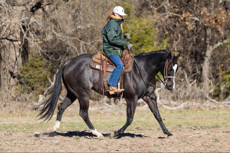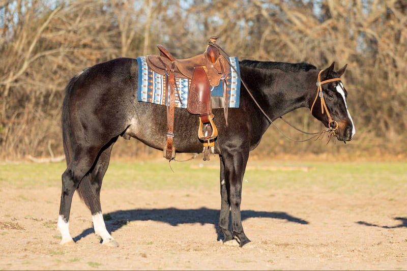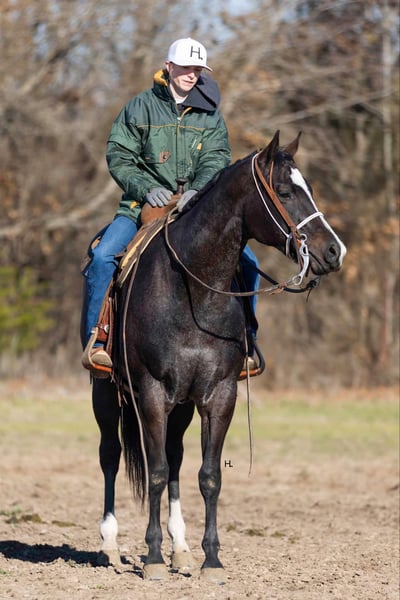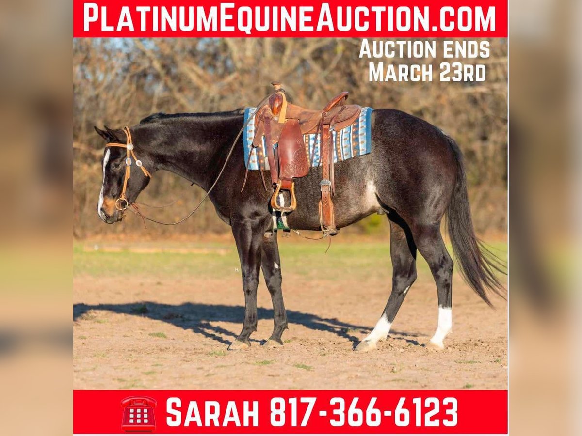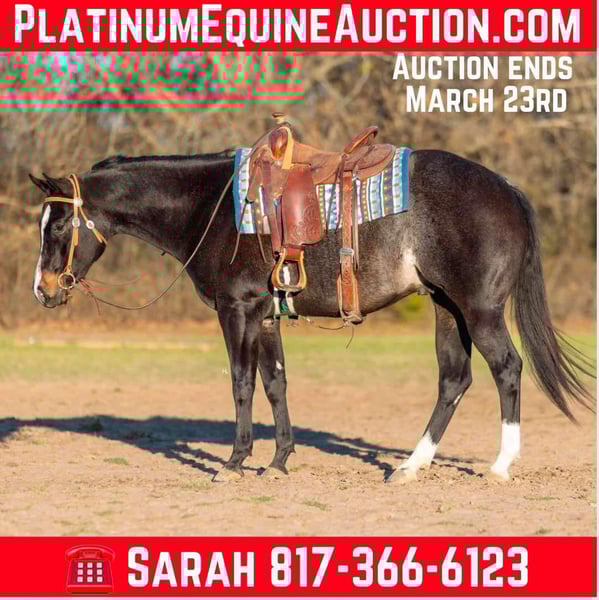 NLINE AUCTION Place your bids at www.PlatinumEquineAuction.com Starting Bid $3500 Auction ends March 23rd, 2025 Need a new saddle? Check out White Rock Saddles on our website or Facebook! Deacon Blue is a jaw dropping 3yr old, 15.2hh, bay roan AQHA gelding by the prestigious and out of a producing daughter of Gotta Get Tuff (full sibling to A Sudden Impulse). Pedigree aside, with his looks, demeanor, and ability, Deacon has absolutely everything going for him to be the next superstar in your lineup. Whether you’re wanting to hit the show pen or just looking for your next up and comer to enjoy at home, this good looking gelding is ready to step up to the plate. Deacon was started in a pleasure program slowly and correctly the beginning of his 2yr old year and then he was transitioned to more of the ranch versatility side of things. All of Deacon’s gaits are smooth and comfortable to ride with an untapped cadence that will surely have everyone drooling that watches him go around. He is soft in his face, his transitions are smooth, and he retains things you teach him well. There is very rarely a day you have to show this gelding something twice as Deacon has a pleasing attitude and all of the ability. Deacon has been ridden both western and english and has been introduced to going over fences. Over fences, Deacon is bold and shows all of the traits that he would not only enjoy doing it but be successful at it. No matter what discipline or direction you decide to finish him out; pleasure, ranch riding, rail, trail, equitation, hunter-jumper; Deacon has the physical ability but most importantly the mind to do it all. If the show pen isn’t your thing, Deacon could easily be turned into the best leisurely riding and trail riding partner one could ask for too. Yes he has everything going for him to be a fantastic performance horse, but most importantly Deacon has the mind to do and be whatever you choose to mold him into. Deacon has been ridden outside an extensive amount of time compared to most bred like him and he’s shown to love it just as much as going around fancily. While Deacon has been with us, we’ve exposed him to all kinds of obstacles and situations to help shape him into the well rounded and versatile gentleman he aspires to be; bridges, tarps, water, vehicle traffic, machinery, hauling off property, farm animals, cattle, flags, etc.. With each obstacle and each situation, Deacon handled it all with the maturity of a horse triple his age and worked through each with a certain boldness and sureness that makes us love him even more. On the ground, Deacon is a perfect gentleman for all daily handling. He loves his grooming time, will stand still for bathing, and your farrier will love him too. You can saddle Deacon tied, cross tied, or ground tied, and he will stand patiently for bridling and mounting as well. Deacon has always hauled with no issues and is ready to load up and unload anytime. To just be around and spend time with Deacon is to love him as his personality is that of a teddy bear. He is an extremely kind and loving gelding that just wants to please and be around you. Deacon is UTD on all routine care, has no previous health or soundness issues and has no scars or blemishes. This would be the perfect DIY horse for an amateur or knowledgeable youth rider that’s looking for their next all around mount that can be enjoyed both in the arena and out or an absolute perfect horse for someone looking for a good minded youngster with the potential to be turned into their next forever-do it all mount. This gelding has been nothing short of a pleasure in our program from riding to handling to everything in between and we know he’ll make someone extremely happy. Feel free to reach out to H Spur Performance & Versatility Horses, Sarah at 817-366-6123 with any questions and to talk about if Deacon might be a fit for you. We invite you to come see, try, and fall in love with Deacon at our home in Weatherford, Tx during the duration of the auction. PPEs are always welcomed and we’re happy to help you set up hauling to wherever you call home if you’re the winning bidder! ONLINE AUCTION Place your bids at www.PlatinumEquineAuction.com Starting Bid $3500 Auction ends March 23rd, 2025 Need a new saddle? Check out White Rock Saddles on our website or Facebook!