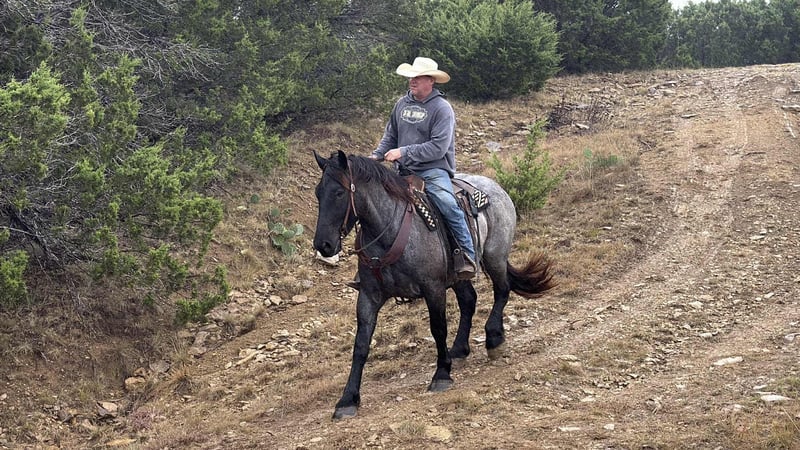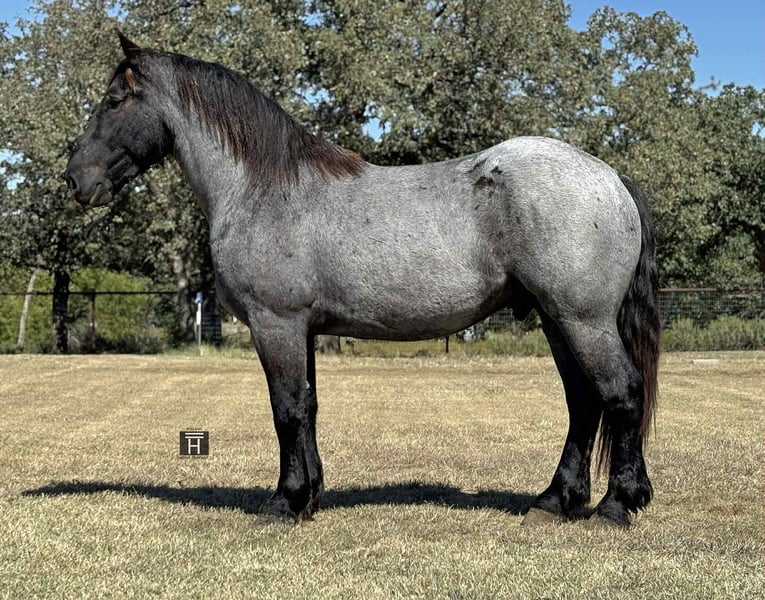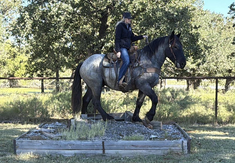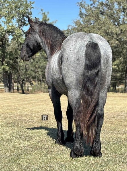 ONLINE AUCTION Place your bids at www.PlatinumEquineAuction.com Starting Bid $3500 Auction ends November 16th, 2025 Need a new saddle? Check out White Rock Saddles on our website or Facebook Vance is a solid made blue roan Percheron/Quarter Horse cross gelding standing 16 hands. He is put together perfectly and heavy boned while still being athletic! Vance is broke to drive single and double. He is broke under English tack as well as Western and has proven gentle in every aspect. We have started Vance lightly over fences to see his potential and he shows a lot of potential. We have hauled Vance to the ranch and on several trail rides and he has proven to be solid, quiet and easy going. He is sure footed and will go anywhere asked of him. He will lead or follow the group and is happy to go off on his own. Vance is traffic safe and has been ridden and drove up and down the highway and back roads. In the arena Vance has 3 solid gaits and easy transitions both up and down. He is well started in a bridle and will also ride in a snaffle bit. We will drag anything and has been exposed to all the scary things which he handled very well. He will stand quietly for mounting and dismounting. Vance hauls well, gets along with other horses, stands tied, bathes, etc. He has good ground manners and is good for the farrier. We have seen zero nonsense, buck, bolt, etc from Vance. He is an easy keeper and very sound. FMI call/text Chanel with Holland Horse Company 559-978-6320. We are happy to answer questions and help arrange shipping! Located in Jacksboro, TX. ONLINE AUCTION Place your bids at www.PlatinumEquineAuction.com Starting Bid $3500 Auction ends November 16th, 2025 Need a new saddle? Check out White Rock Saddles on our website or Facebook
