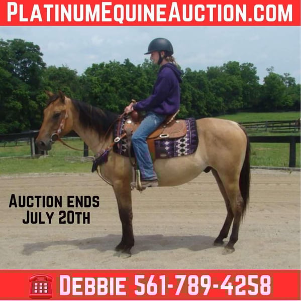 ONLINE AUCTION Place your bids at www.PlatinumEquineAuction.com Starting Bid $3500 Auction ends July 20th 2025 Need a new saddle? Check out White Rock Saddles on our website or Facebook Marcus is just what everyone is looking for!!! He is very friendly, easy going guy, safe, smart, well trained and he is also easy on the eyes with that beautiful buckskin coat! He is a 4 yr old but acts like most 10 year olds and he is a well built, 14hh gelding. Marcus has a beautiful walk, trot and canter, he transitions effortlessly and is smooth throughout. He is great in the arena or down the trails. He will cross ditches, creeks, deadfall, up/down steep slopes and he does it all with confidence so that even if the rider isn’t sure what is going on… he knows how to handle himself in order to keep everyone safe. We have jumped him and done trail obstacles, and he is great and willing for whatever is asked. He can be ridden alone or with others and is the same either way. He has excellent ground manners and is easy to catch. We are located in Lexington, KY. Contact Debbie Grier 561-789-4258 with any questions. ONLINE AUCTION Place your bids at www.PlatinumEquineAuction.com Starting Bid $3500 Auction ends July 20th 2025 Need a new saddle? Check out White Rock Saddles on our website or Facebook