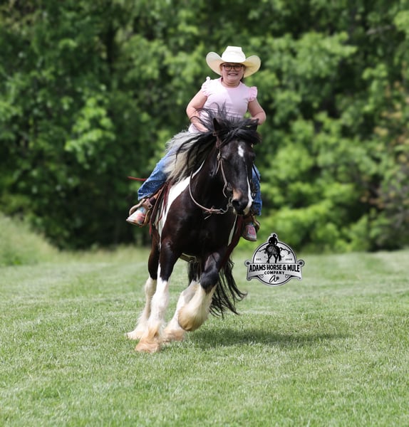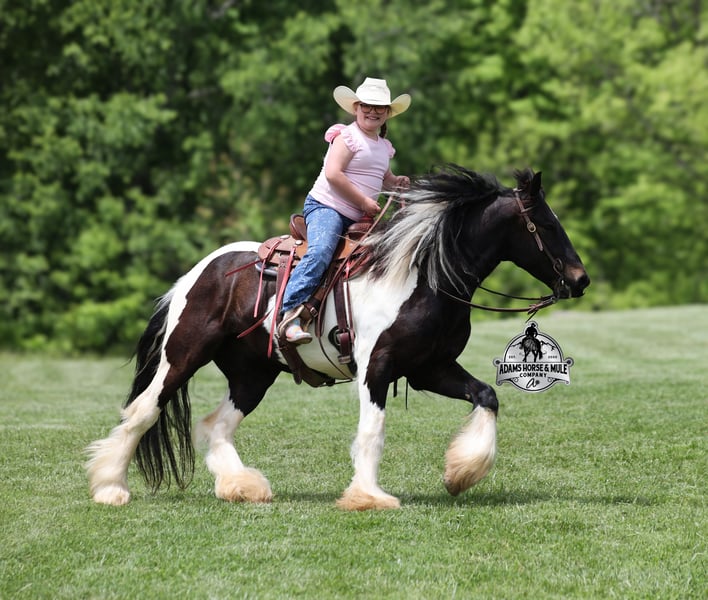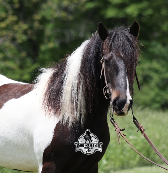 Meet Domino! This fancy looking Black Tobiano Gypsy Cross Gelding stands 14H and he is stocky built, he is 4 years old but its wise beyond his years! Domino has completed the natural horsemanship program and he is very friendly and loves attention!! He knows some tricks as well as he will lay down. Domino has done it all from being ridden by small children down the highways to being ridden around the ranch, pasture roped cows, rode fences and cruised the trails. Domino is confident out riding alone and does fine in groups. When out on the ranch or going down the trails he will cross creeks, ditches, logs and navigate rough, rocky areas. He is safe in traffic safe whether that be trucks or cars. He walks out easily, has a nice jog, his lope is slow and collected plus he lopes very nice circles! He has been exposed to all kinds of wildlife such as deer or turkey. He is athletic and would be a great horse to put under English tack to go over the rails with. He pastures well with others and rides the same after time off. Domino is a fun horse to ride and is sure to be everyone’s favorite! Feel free to call Eric 606-308-2461 with any questions! Go to visit our website for more pics and a video www.AdamsHorseAndMuleCo.com AHAMC has been in the horse business and sold horses over the internet since 2005. We have a long track record of success with hundreds of happy customers. We work hard to match riders with the correct horses and specialize in beginner safe, family friendly horses that have been used and checked out by our family! We can set up transportation anywhere in the US and look forward to working with you.