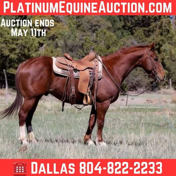 ONLINE AUCTION Place your bids at www.PlatinumEquineAuction.com Starting Bid $3500 Auction ends May 11th, 2025 Need a new saddle? Check out White Rock Saddles on our website or Facebook! Regalo is a grade 4 year old gelding standing 14.1hh. This awesome gelding is the definition of gentle!! Whether you’re 6 years old or 86 years old and can sit in the saddle while holding the reins you’ll be able to ride Regalo and enjoy every second of it! Lope pretty circles or cruise on down the arena, Regalo is just as fun outside on the trail and in the arena! Mosey on through brush, over fallen logs, through flowing rivers, cruising traffic through town, rough country, anything you can think of Regalo will mosey right on through. Regalo is just as gentle and good minded in the arena! He will walk, trot, and lope both ways with ease as well as neck rein and has a good stop. This gelding is absolutely gentle, good minded, kind hearted, and always willing to please! Not a thing phases him!! If you’re looking for your next adventure buddy then look no further, Regalo is your guy! He is easy to catch and good to groom, saddle, bridle, bathe, shoe, and load!! Will come with a clean coggins and health! Located in Camp Verde, AZ. Contact D/C Equine Services Dallas 804-822-2233 with any questions. ONLINE AUCTION Place your bids at www.PlatinumEquineAuction.com Starting Bid $3500 Auction ends May 11th, 2025 Need a new saddle? Check out White Rock Saddles on our website or Facebook!