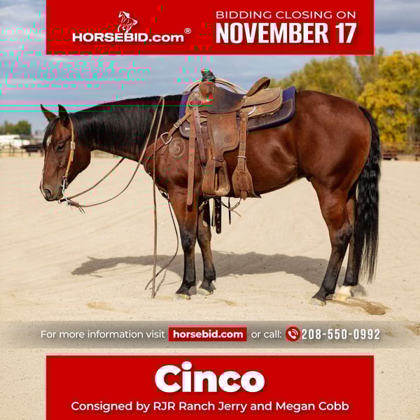 🎲𝓽𝓱𝓮 𝐑𝐈𝐃𝐄𝐑'𝐒 𝓒𝓱𝓸𝓲𝓬𝓮🎲 Happening now thru MONDAY | NOVEMBER 17th - Available EXCLUSIVELY on HorseBid's website! For more details and to register visit: www.Horsebid.com CONSIGNOR CONTACT: RJR ranch Jerry and Megan Cobb 208-550-0992 LOCATION: New Plymouth BREED: Aqha REGISTERED: Yes REGISTERED NAME: Cfive spoonful o pep COLOR: Bay HEIGHT: 14.2 AGE: 4 GENDER: Gelding Cinco is a really cool gelding he’s 100% safe with a ton of ability and training. He spent over a year at the cowhorse trainers before going to the ranch and has also been used in the arena to breakaway and heel on. Cinco is very nice to ride outside on the trails as well This gelding moves exceptionally well, he’s got a big stop nice turn around and is a super good loping horse. He carries himself low to the ground and can really move his front end. Cinco shows big time talent in the breakaway and is ready for anyone to continue his training. He’s good in the box and is real cowy. Cinco is a little watchy of cows and wouldn’t fit an inexperienced roper. He’s been used up in the mountains to gather and has been branded on as well. Cinco really likes people has great manners and is a pleasure to be around all the time. This is a very nice horse that can go in many different directions in the performance world or go trail ride him. He’s sound and has no buck. Call fmi 208 550 0992