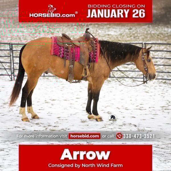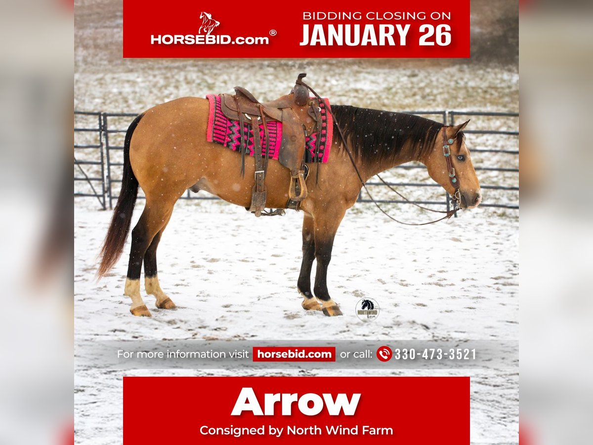 𝐉𝐀𝐍𝐔𝐀𝐑𝐘 ⭐️𝑨𝒍𝒍 𝑺𝒕𝒂𝒓 𝑳𝒊𝒏𝒆𝒖𝒑⭐️ Happening now thru MONDAY | JANUARY 26th - Available EXCLUSIVELY on HorseBid's website! For more details and to register visit: www.Horsebid.com CONSIGNOR CONTACT: North Wind Farm 330-473-3521 LOCATION: Fredericksburg, OH BREED: AQHA REGISTERED: Yes REGISTERED NAME: Two Red Hot COLOR: Buckskin HEIGHT: 14.3 AGE: 5 GENDER: Gelding Introducing Two Red Hot, “Arrow” He is a 5 yr old buckskin AQHA gelding, standing at 14.3hh. Arrow is well trained to ride and has great ground manners! He is very respectful and listens well. He loves attention and is always ready to be groomed and to be loved on. He stands good for tacking up and for getting bathes! He picks up his feet easily. He can be turned out in the pasture with other horses. He is easy to catch! Arrow can be rode bareback as well as western. He can also go bridless! He moves off of leg pressure, he has a nice side pass and spin. He will neck rein and direct rein! He has a fun to ride walk, trot, canter! It’s smooth and easy to ride! Arrow will go through all the obstacles. He has been on a lot of trails and is seasoned riding out and about! He is used to being around dogs, and atvs! He doesn’t mind the tarp or the ball. He is surefooted out on the trails! He crosses creeks with no issues. Arrow is a super nice all around horse that has enough buttons for some small shows but is safe enough for your family to take out on the trails! He is very versatile and truly a dream to own! ⭐️North Wind Farm is renowned for its quality trail and all-around horses. Our horses are versatile and can excel in any discipline, making them perfect for riders of all levels. Whether you're looking for a reliable trail companion or a horse that can perform in various disciplines, North Wind Farm has the perfect match for you. Our commitment to excellence and passion for equine care ensures that each horse is well-trained, healthy, and ready to meet your needs. Contact us @ Tim (330)600-8840 Lisa (330)473-3521 ♦️Current Coggins ♦️Sells with a 30 day soundness guarantee!