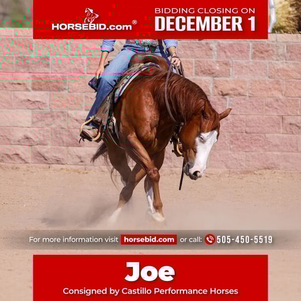 ⚜️ 𝓽𝓱𝓮 𝐇𝐨𝐫𝐬𝐞𝐦𝐚𝐧'𝐬 𝓢𝓱𝓸𝔀𝓬𝓪𝓼𝓮⚜️ Happening now thru MONDAY | DECEMBER 1st - Available EXCLUSIVELY on HorseBid's website! For more details and to register visit: www.Horsebid.com CONSIGNOR CONTACT: Castillo Performance Horses 505-450-5519 LOCATION: Belen, NM BREED: Quarter Horse REGISTERED: Yes REGISTERED NAME: MIZZEN MY CASH COLOR: Sorrel HEIGHT: 14.3 AGE: 4 GENDER: Gelding Joe has more personality packed into one chromed-up package than seems fair. Standing 14.3 hands and weighing 1,100 pounds, he’s built right—balanced, strong, and striking enough to turn heads everywhere he goes. Cute as a button with those expressive eyes, Joe is the kind that everyone falls in love with instantly. He isn’t just handsome—he’s proven. Joe helped the New Mexico State Fair Queen win her crown, carrying her with confidence, style, and that trademark kindness he’s known for. He’s incredibly user-friendly, trustworthy for a wide range of riders, and has the kindest heart you’ll find. On the trail, he’s an old soul—steady alone or in a group, quiet after time off, and unfazed by dogs, four-wheelers, traffic, or farm equipment. He’ll even cruise bareback without a fuss. Always eager for the day’s adventure, Joe meets you at the stall door ready to go. Under saddle, he’s smooth, stylish, and a blast to ride. His ground-covering trot is effortless to sit, and his “whoa” is as honest as they come. With a strong reining foundation, Joe offers easy lead changes, soft spins, and simple, enjoyable buttons that make him fun for anyone to get along with. Bred in the purple, Joe is by Lil Joe Cash (NRHA Open Futurity Champion, $279K LTE, $4M sire) and out of a Gunner daughter crossed on Shining Spark. His pedigree screams performance, yet his gentle nature makes him a lifelong partner for riders of many levels. Whether you need a flashy, steady trail horse, a versatile ranch partner, or an arena-ready gelding with elite bloodlines and the best mind in the barn, Joe checks every box. He blends pedigree, performance, and personality into one irresistible package—and everyone who meets him loves him. We’d love to introduce you to Joe. 📞 Call Estevan at (505) 450-5519 to chat or set up a time to come ride.