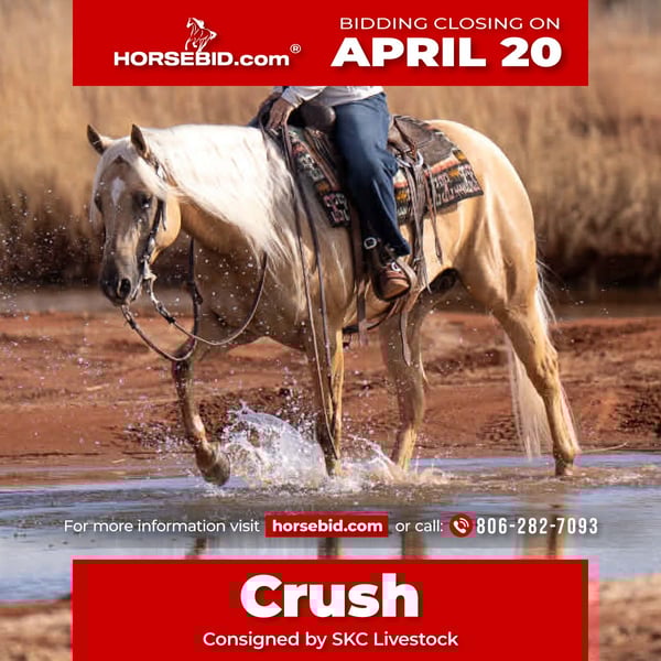 ⚜️𝐭𝐡𝐞 𝓔𝓵𝓲𝓽𝓮 𝐒𝐩𝐫𝐢𝐧𝐠 𝐂𝐥𝐚𝐬𝐬𝐢𝐜⚜️ Happening now thru MONDAY | APRIL 20th - Available EXCLUSIVELY on HorseBid's website! For more details and to register visit: www.Horsebid.com CONSIGNOR CONTACT: SKC Livestock 806-282-7093 LOCATION: Canyon, TX BREED: Quarter Horse REGISTERED: Yes REGISTERED NAME: Just Crush It COLOR: Palomino HEIGHT: 15 AGE: 5