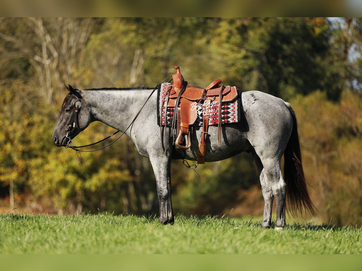 Meet Tokyo, a beautiful, good-minded 2021 model blue roan Grade Quarter Horse gelding standing a strong 15 hands tall with all the right looks and an even better attitude. His blue roan dappled color, one white hind sock, and small white star set perfectly on his forehead make him a true standout everywhere he goes. Pair with a bright, soft eye and a natural want-to-please attitude, and you have a gelding that is as dependable as he is attractive. Tokyo is the kind of horse you can ride out of the barn any day of the week and know exactly what you are getting. He drops his head right where it should be, settles into his work, and stays quiet, soft, and steady from start to finish. He does not require daily riding to stay safe and honest—give him a couple of days off or give him a week, he comes back the same every time. He has been exposed to all kinds of environments and takes everything in stride. Tokyo has seen new places, covered lots of trail miles, and is confident in both indoor and outdoor arenas. He has been down state roads and through traffic without batting an eye. Jugs, tarps, whips, water crossings, logs, uphill, downhill, you can point him anywhere and he goes with confidence and charm. Versatility is another thing he offers in spades. Tokyo rides western, English, and bareback, will side pass, ride bride less, and stay soft in the bridle. He is the kind of horse you can trust for kids, seniors, beginners, or advanced riders. He is solid and forgiving, yet responsive enough for someone who wants to do more. He rides out alone or with a group and keeps a calm, collected way of going that makes every ride feel steady and dependable. He has a good forward walk, a willing trot, and a consistent way of carrying himself that makes him enjoyable for riders of all levels. In the barn or wash bay he is calm, mannerly, and easy to handle. He is also good with loading and unloading from the trailer, making hauling a breeze. Tokyo is up to date on deworming, vaccinations, and shoeing and is ready to fit seamlessly into someone’s program, family, or riding routine. If this sounds like the horse that you have been looking for, please feel free to reach out to Duane @ 330-231-2324 for more info or to Schedule a day to stop by our farm.
