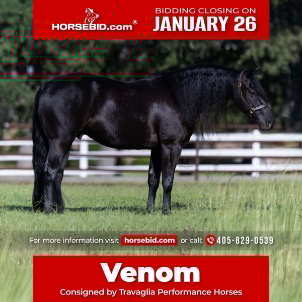 𝐉𝐀𝐍𝐔𝐀𝐑𝐘 ⭐️𝑨𝒍𝒍 𝑺𝒕𝒂𝒓 𝑳𝒊𝒏𝒆𝒖𝒑⭐️ Happening now thru MONDAY | JANUARY 26th - Available EXCLUSIVELY on HorseBid's website! For more details and to register visit: www.Horsebid.com CONSIGNOR CONTACT: Travaglia Performance Horses 405-829-0539 LOCATION: Burleson, TX BREED: Aqha REGISTERED: Yes REGISTERED NAME: GUNNA BE SMOKEY COLOR: Black HEIGHT: 15 AGE: 5 GENDER: Gelding If you’re searching for a gelding that can be used on your ranch or ridden down the trail one day and confidently step into the performance arena the next, meet Venom! A gorgeous 15-hand, 5-year-old black gelding with a heart as big as his stop, Venom has had great training his entire life, giving him a solid foundation built on consistency, trust, and care. He’s exceptionally personable, always willing, curious, and full of character. Venom is a trained reining horse that has been hauled and shown, he has also been started with professional roping training and has been used for all aspects of ranch work. He would make a great ranch rider. He has been around cattle and rode miles outside. Whatever you set your mind to he has had the miles and training to be right there with you! He has been started roping Venom goes exactly at the pace you ask. He naturally slows down without hesitation, yet he is equally happy to step up when asked. His jog, lope, and long trot are smooth, balanced, and comfortable, making every ride a joy. He has a huge, confident stop, clean, easy turnarounds, and effortless lead departures. Whether it’s a simple ride around the ranch or a trail ride across varied terrain, or roping a calf or steer Venom remains steady, responsive, and confident every step of the way. He’s been around cattle and navigates new situations or arenas with ease. On the ground, Venom is just as easygoing. Polite, kind, and fun to be around, he has a personality that keeps you smiling—expressive, affectionate, and always eager for scratches or treats. He’s a gentleman in the stall, excellent in cross-ties, loads and hauls without issue. Veno is sound, well-built, and just all around dependable. He’s a horse you can ride every day—or give a week or two off and jump back on, confident that he’ll be exactly the same. With smooth, balanced gaits, a willing attitude, and a big personality, Venom is versatile, consistent, and ready to become your next lifelong partner. Pedigree-wise, Venom is sired by A Vintage Smoke , an earner of $600,600 and a Million Dollar Sire. His dam, Gunna Be Spooky, is a daughter of the legendary Gunnatrashya, giving Venom both the talent and mind that riders look for. Venom is eligable for the Gold Buckle Futuritys, North American Reining Stakes, International Ranch Horse Incentive, Terry comes is up to date on vaccinations, has clean X-rays and is located in Burleson, Texas, we welcome anyone to come meet and try Venom to see for themselves why we love him so much. If you’re looking for a horse with the heart, talent, and personality to be both a competitive partner, don’t let this one pass you by. We can help arrange hauling and have shipped horses all over the United States and even internationally! Don’t hesitate to call us with any questions!