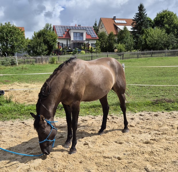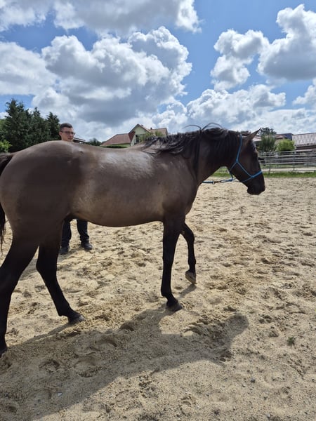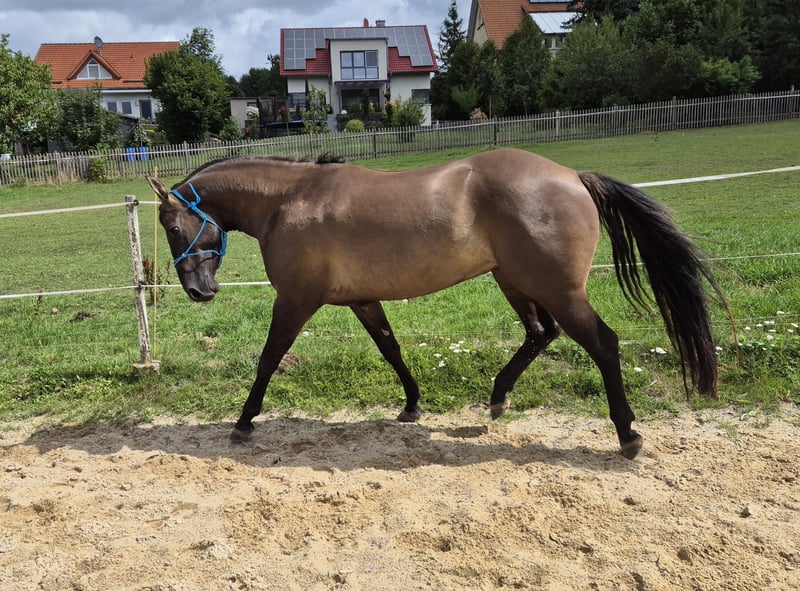 "HOSSA DUNIT MAXEN" (Rufname: "BEN") Ben ist ein wunderschöner Grullo Wallach. Wir haben ihn als Fohlen gekauft um mit ihm unsere kleine Quarterhorse-Zucht weiterzuführen. Wir haben von ihm zwei Söhne bekommen, auf ein weiteres Fohlen hoffen wir im nächsten Jahr. Jetzt ist er ein glücklicherer Wallach und läuft in unserer Herde mit Stuten, seinem kleinen Sohn und einem weiteren Wallach. Ben wird im nächsten April 5 Jahre alt und uns ist bei uns völlig unterfordert. Wir haben gelegentlich ein wenig Bodenarbeit mit ihm begonnen und er ist für März 2026 bei einem Profi-Trainer zum Beritt angemeldet. Der reservierte Platz kann übernommen werden. Ben hat einen wunderbaren Körperbau, geniale Beine, schwarze Hufe und ein wunderschönes Gesicht. Vom Charakter ist er dem Menschen zugewandt, beißt nicht, tritt nicht, schmiedefromm. Ben hat es verdient eine Hauptrolle zu spielen. Bei uns hat er nur eine Nebenrolle. Wir möchten unseren Bestand reduzieren: Ebenfalls abzugeben ist sein wunderschöner Sohn, geboren Juni 2025 und/oder eine tragende buckskin-Stute geboren 2022. Bitte rufen Sie an oder kontaktieren uns einfach über Handy Nr. 015780273780.