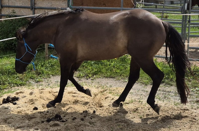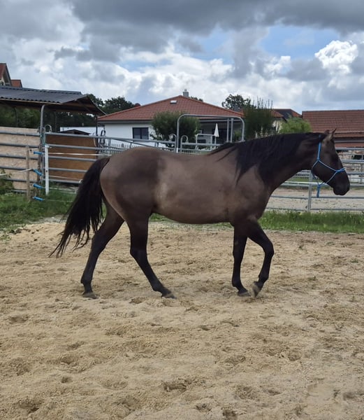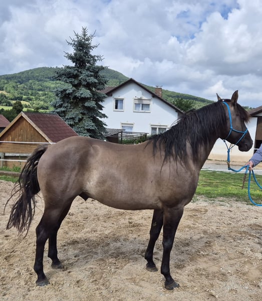 "HOSSA DUNIT MAXEN" (Call name: "BEN") Ben is a stunning grullo gelding. We purchased him as a foal to continue our small Quarter Horse breeding program. He has sired two foals so far, and we are expecting another next year. Currently, he is a happy gelding and lives with our herd of mares, his young son, and another gelding. Ben will turn 5 years old next April, and he is currently underutilized with us. We have started some groundwork with him occasionally, and he is booked for training with a professional trainer in March 2026. The reserved spot can be transferred. Ben has an excellent conformation, great legs, black hooves, and a beautiful face. In terms of character, he is very friendly towards people, does not bite or kick, and is well-mannered. He deserves to play a leading role. Here with us, he only has a secondary role. We are looking to reduce our herd: we are also offering his beautiful son, born June 2025, and/or a pregnant buckskin mare born in 2022. Please call us or contact us easily via mobile at +49 1578 0273780.