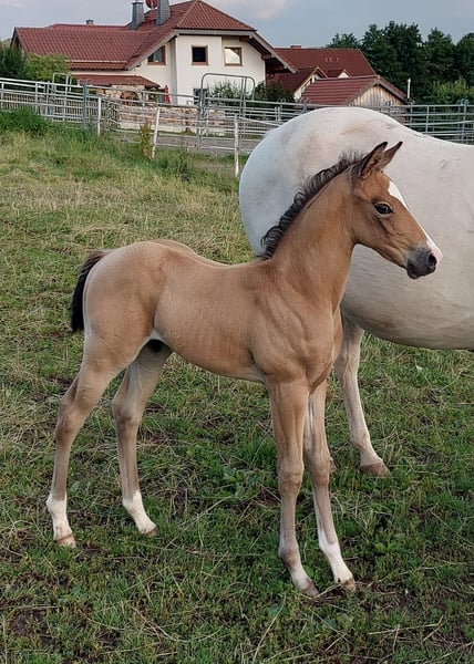 A real HINGUCKER: Our first foal from this mating has exceeded all our expectations. Light bay (so far), with a wonderfully sloping shoulder for a long gait, light-footed and agile. A super powerful hindquarters and absolutely correct conformation promise a sporting companion who is ready for action. HIGH NOON" is equipped with a good and correct foundation and a high probability of becoming relatively tall. Both parents can be viewed here at the farm: Dam Perlino, sire Grullo. The Certificate of Registration has been applied for and will arrive in the next few weeks. If you want to have a look: the mother's name is Hollywood Blue Ice, the father is Hossa Dunit Maxen. A video can either be uploaded or we can send it via WA. Price approx. 7.400 € / negotiable. Please call or contact us via messenger (wa): 015780273780