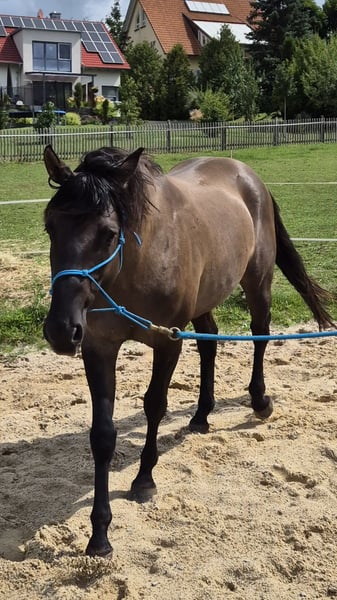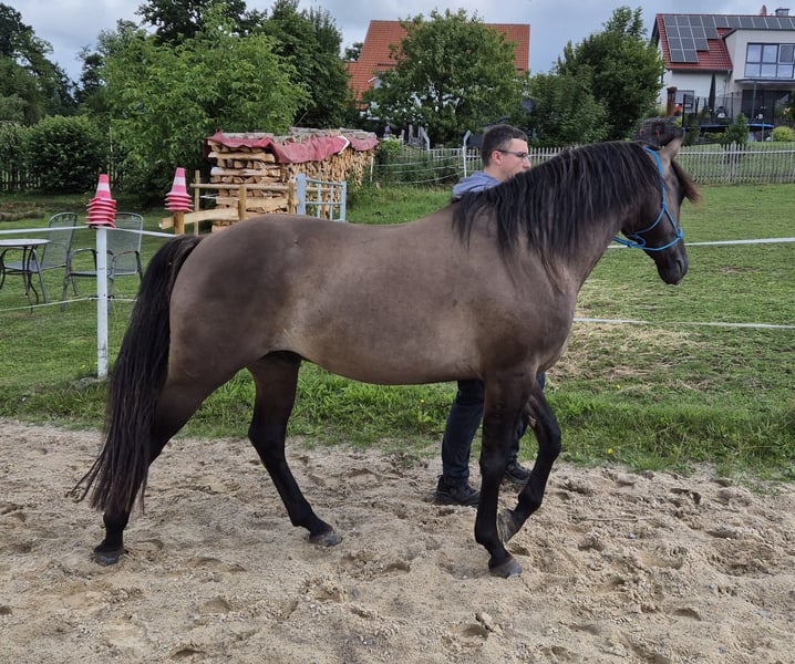 "MAGIC STEELDUST": Un tipo davvero cool. È nato a giugno 2024 e attualmente si trova al pascolo con il suo amico "Faust". Ad aprile 2025 è stato castrato, per facilitare la ricerca di una nuova famiglia. Dusty cerca un nuovo ambiente, preferibilmente in un bel gruppo. Dusty è buckskin e con una straordinaria e bella marcatura sul viso, è un sogno di cavallo. Inoltre, Dusty è dotato di una meravigliosa spalla inclinata per movimenti ampi, così come di un posteriore super potente per manovre agili e leggere. Promette di diventare un compagno sportivo entusiasta. La sua struttura assolutamente corretta e una buona base offrono le migliori condizioni per una vita lunga e sana da cavallo. Si prevede che raggiunga, come i suoi mezzi-fratelli, un'altezza finale di circa 154 cm. Per carattere è molto tranquillo e forte di nervi, va bene anche da solo dal pascolo, è addestrato al guinzaglio e dà i piedi - quindi è addestrato in base alla sua età. Il padre: Hossa Dunit Maxen è un Grullo, la madre: Hollywood Blue Ice è Perlino. Il certificato di registrazione è già disponibile in originale. Prezzo 6.800 € trattabili - è ancora il prezzo da puledro - vale la pena vederlo! Si prega di chiamare o contattarci semplicemente al numero di cellulare 015780273780. E venite a trovarci volentieri in Rhön.