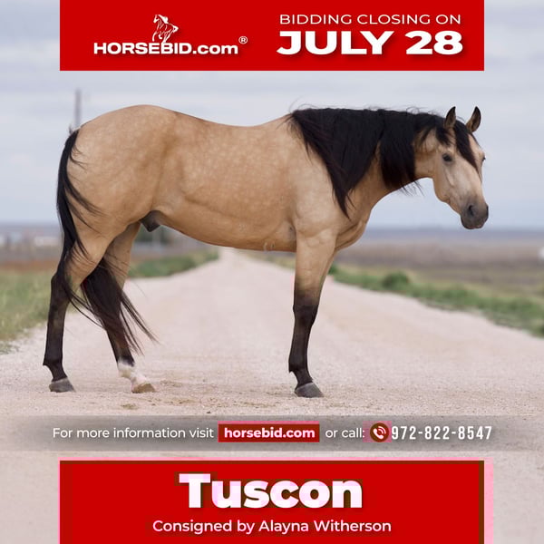 ⚔️ The HORSEMAN's Select ⚔️ Happening now thru MONDAY | JULY 28th - Available EXCLUSIVELY on HorseBid's website! For more details and to register visit: www.Horsebid.com CONSIGNOR CONTACT: Alayna Witherson 972-822-8547 LOCATION: Kaufman Tx BREED: Quarter Horse REGISTERED: Yes REGISTERED NAME: Heartthrob COLOR: Buckskin HEIGHT: 15.1 AGE: 5 GENDER: Gelding Tucson is a big strong gelding with a goofy personality and drop dead gorgeous looks. He’s been used to take care of feed yard cattle and check wheat pastures his whole life. Tucson would make an excellent head horse or performance horse and he’s gentle and good to be around. Easy walk trot and lope one handed spins, side passes both ways and has enough heart to go all day.