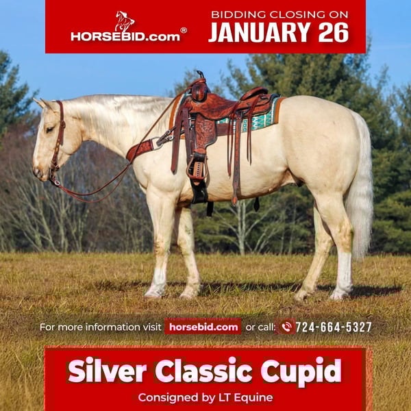 𝐉𝐀𝐍𝐔𝐀𝐑𝐘 ⭐️𝑨𝒍𝒍 𝑺𝒕𝒂𝒓 𝑳𝒊𝒏𝒆𝒖𝒑⭐️ Happening now thru MONDAY | JANUARY 26th - Available EXCLUSIVELY on HorseBid's website! For more details and to register visit: www.Horsebid.com CONSIGNOR CONTACT: LT Equine 724-664-5327 LOCATION: Miola, PA BREED: AQHA REGISTERED: Yes REGISTERED NAME: Slver Classic Cupid COLOR: Palomino HEIGHT: 15.1 AGE: 5 GENDER: Gelding ✨ Introducing Silver Classic Cupid ✨ Barn name: Cupid — and he truly lives up to it! Cupid is a coming 5-year-old AQHA registered gelding standing approximately 15.1 hands with a big, stocky build and a heart of gold. He’s an absolute love bug with no mean bone in his body and the kind of personality everyone hopes to find. Although young, Cupid rides more like a seasoned 10-year-old. He is very nicely broke and versatile—happy to go western, English, show pen, or hit the trails. No matter the job, he’s willing, honest, and always tries his best. In the arena, Cupid: • Neck reins • Side passes • Picks up both leads at the canter • Carries a nice headset and frame He’s easy to get along with and forgiving, making him a great match for just about any level rider. On the trail, Cupid is confident and steady. He rides out alone or in a group, goes through mud, handles rough terrain with ease, and takes cowboy obstacles in stride. If he doesn’t understand something right away, he’ll stop and think—and then try his hardest. He’s unfazed by flags, tarps, or even the giant teddy bear. Cupid is low on the pecking order, gets along well with others, and does great whether turned out in pasture or kept in a stall. He: • Hauls easily • Stands tied quietly • Is excellent for the farrier and vet • Stands patiently for bathing and grooming 💙 If you’re searching for a true “forever horse,” Cupid could be your guy. He comes with: ✔️ Current veterinary health exam ✔️ Current Coggins and vaccinations ✔️ Fresh front shoes ✔️ Ready to ride! 📞 For more information, call or text: 724-664-5327 Thank you!