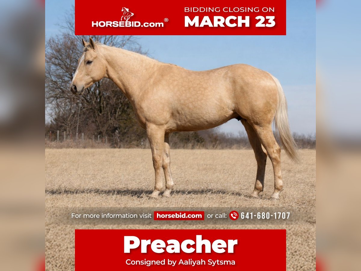 ⚜️𝓽𝓱𝓮 𝐆𝐎𝐋𝐃 𝓢𝓮𝓵𝓮𝓬𝓽⚜️ Happening now thru MONDAY | MARCH 23rd - Available EXCLUSIVELY on HorseBid's website! For more details and to register visit: www.Horsebid.com CONSIGNOR CONTACT: Aaliyah Sytsma 641-680-1707 LOCATION: Cincinnati, IA BREED: AQHA REGISTERED: Yes REGISTERED NAME: He’s Livin Ona Prayer COLOR: Palomino HEIGHT: 15.2 AGE: 5 GENDER: Gelding “Hes Livin Ona Prayer” 2020 model AQHA gelding standing 15.2 hands tall! He is also registered through the Palomino Horse Breeders Of America. This guy is super shapey, very well broke, personable, and a true joy to ride! Out on the trail Preacher is as reliable as they come! He goes the pace you ask, sure footed, crosses anything you put in his path, and aims to please! He’s level headed in the front, back, or middle of the pack! He doesn’t mind if another horse is right up behind him, and he won’t try to run into any trees. Down the road Preacher is traffic safe! Big semi’s, loud cars- he dosent bat an eye. In the arena he is BROKE! Collects into the bridle, takes his leads, pivots, side passes, ect. He has a lot of buttons and is super fun to ride! In the arena we do recommend an intermediate as he is soft and sensitive with his cues. Preacher has zero buck, bite, rear, or kick. He stands tied, saddles easy, loads well, he can be slightly goofy about bridling but just take your time and you won’t have any issues! Preacher does have an old scar on his front cannon bone but is 100% sound! If you’re looking for a solid trail mount and some fun in the arena this is your guy!
