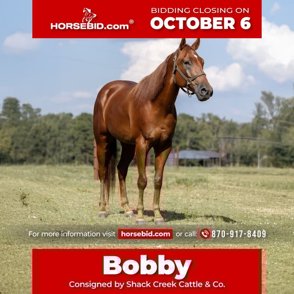🍂 𝓐𝓾𝓽𝓾𝓶𝓷 𝑨𝑳𝑳 𝑺𝑻𝑨𝑹 𝑳𝑰𝑵𝑬𝑼𝑷 🍂 Happening now thru MONDAY | OCTOBER 6th - Available EXCLUSIVELY on HorseBid's website! For more details and to register visit: www.Horsebid.com CONSIGNOR CONTACT: Shack Creek Cattle & Co. 870-917-8409 LOCATION: Sheridan, AR BREED: Quarter Horse REGISTERED: Yes REGISTERED NAME: Bouncin Bartender COLOR: Sorrel HEIGHT: 15.2 AGE: 5 GENDER: Gelding 💪🍸🍺Bouncin Bartender🍺🍸💪 With names like Two ID Bartender made famous by the Pitzer Ranch in his pedigree, Bobby has the size, athleticism and genetics to do just about anything. He is a sweet horse with a kind eye, dark red coat, and a beautiful long, thick mane. Bobby genuinely loves to be in the presence of people always approaching the gate when people are near seeking some attention. He is in tune with what you're doing and is always watching you inquisitively. He's easy to catch no matter the size of pasture, and is a in your pocket type horse yet he is very respectful of your space on the leadline. Bobby loads right up into the trailer eager for any adventure that awaits him. At the young age of five Bobby has his whole life ahead of him and he continues to grow in experience with every ride which will allow him to go on to finish out in any direction with his next rider. Bobby has a huge stride and covers ground effortlessly in a trot. His lope is smooth and he will come to a stop by simply uttering the word whoa. He listens intently for verbal cues when asking for the next gait. He conveniently stands at a block or barrel to be mounted and dismounted making it easy for shorter riders or those just needing a boost. Bobby came from his orginal owner/breeder to us and we have spent the past two months giving him a tune up spending a majority of time riding in the arena however he is gaining more confidence riding outside on the trails and around the ranch. He is a talented young prospect that is suitable to go into any western or english discipline as a performance horse with a skilled rider. Bobby has good manners on the ground too, he fly sprays, bathes, stands tied to be saddled and for the farrier. When given the option he "goes" outside of his stall in his turnout and keeps a very tidy stall and for someone who cleans their own stalls that alone is worth a lot. He does like a buddy in the barn or pasture beside him but will ride off alone. He has been pastured with multiple horses before and is in the middle of the pecking order. Bobby will paw at feeding time if he is the last one fed but other than that we have not observed any bad habits with him. His video and photos showcase that we have worked to expose Bobby to ropes, cattle, dogs, bouncing balls, bicycles, water, bridges, flags, parades, guinea fowl as well as motorized vehicles. Bobby is current on his vaccinations, deworming, dental care and farrier work and has had a comprehensive veterinary physical examination recently completed. He has clean, scar free legs and no history of illness or any major injuries. He does have one scar on his right buttock near his tail. To this point Bobby has been low maintenance and travels barefoot with solid black feet getting trimmed every four weeks. A copy of his negative coggins test and health papers will also be provided if shipping is required. We would love to answer any questions you may have about him and hope to find him the perfect rider that can take him to the next level. Please call or text 870-917-8409