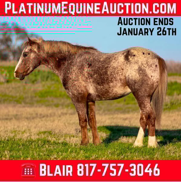 ONLINE AUCTION Place your bids at www.PlatinumEquineAuction.com Starting Bid $3500 Auction ends January 26th, 2025 Need a new saddle? Check out White Rock Saddles on our website or Facebook! Bambino aka “Bamb” is a 13.3H, 5 yr old Appaloosa gelding. Bamb is the cutest little step up pony for a handy youth or adult looking for something COMFY, small and fun! He is put together super correct and is one of the most handsome little app ponies we’ve ever represented! He has spent the last couple years as a handy kid playday horse, once they were ready for bigger performance horses, he moved on to a trail pony for a younger adult lady! Not many ponies have the handle this guy does! He’s broke like a seasoned big horse, very light to ride around, one hand broke and stops excellent! Bamb is EXTREMELY comfortable and has very floaty gaits! With a little more training, he’d easily make a little breakaway / rope horse prospect as he naturally wants to stop! He’d also be the perfect little rodeo horse for the handier kids wanting something fun and athletic!! Bambino goes the speed you ask, when you ask of him and is easy to ride and get along with. He’ll walk through water, and stays quiet on trails and in the arena. He’s happy to do any job you put him to and will go all day if you need. Bamb is NOT your typical “hot” pint sized jar of fun. He is calm, cool and collected and will never go faster than you ask! He’s NOT a “blown up” playday pony by any means. He’s very respectful and only really wants to please. Many horses his size are yee yawed around on by kids and as a result are hot and fractious to ride. NOT Bamb! He’s been rode by very respectful, handy kids that have rode him correctly! Being that he’s only 5, we do suggest an experienced rider only due to the fact he is pretty handy and athletic! He loads, leads, bathes, ties good and is UTD on feet, teeth and coggins! You don’t want to miss this unique opportunity to own an extremely put together, gorgeous little app gelding! Watch his video and go to his website page northtexashorsecompany.com/bambino for more pictures and footage! Please call Blair with North Texas Horse Company for more info at 817-757-3046. We LOVE to talk about him! We are located in Weatherford, TX and can help arrange affordable shipping to anyone!!